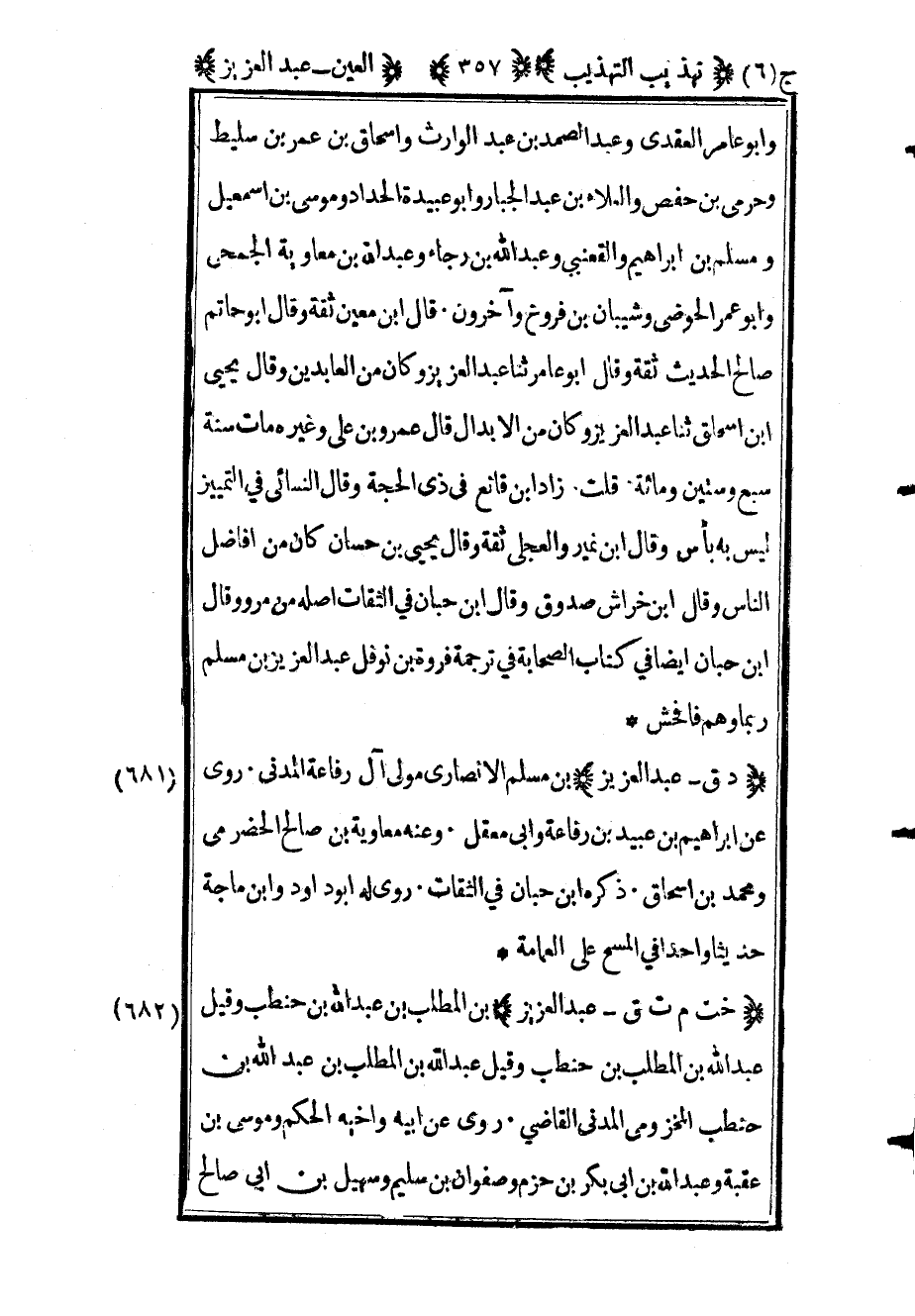 684 - "د ق عبد العزيز" بن مسلم الأنصاري مولى آل رفاعة المدني روى عن إبراهيم بن عبيد ابن رفاعة وأبي معقل وعنه معاوية بن صالح الحضرمي ومحمد بن إسحاق ذكره بن حبان في الثقات روى له أبو داود وابن ماجة حديثا واحدا في المسح على العمامة.