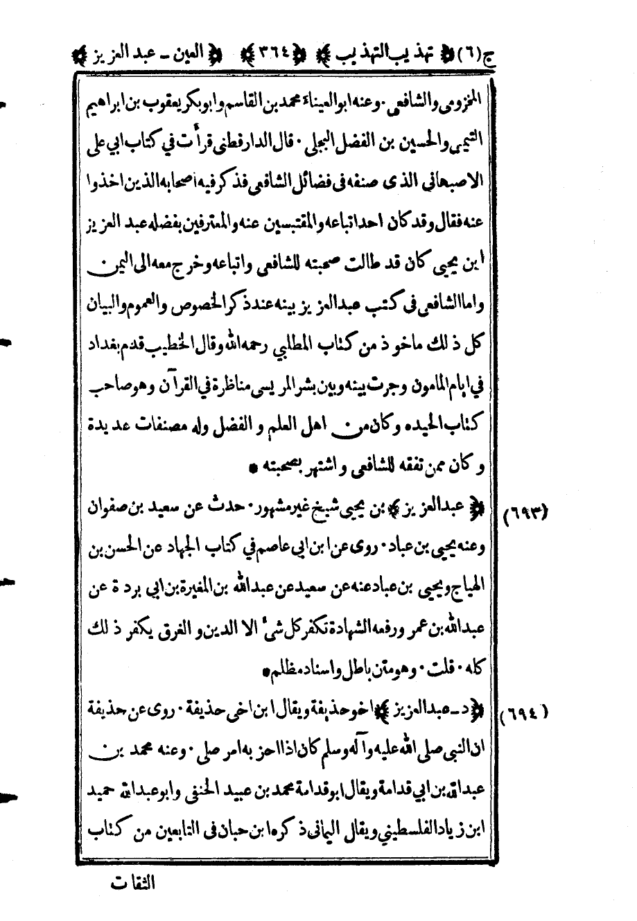 697 - "د عبد العزيز" أخو حذيفة ويقال ابن أخي حذيفة روى عن حذيفة أن النبي صلى الله عليه وآله وسلم كان إذا أحزبه أمر صلى وعنه محمد بن عبد الله بن أبي قدامة ويقال أبو قدامة محمد بن عبيد الحنفي وأبو عبد الله حميد بن زياد الفلسطيني ويقال اليماني ذكره بن حبان في التابعين من كتاب