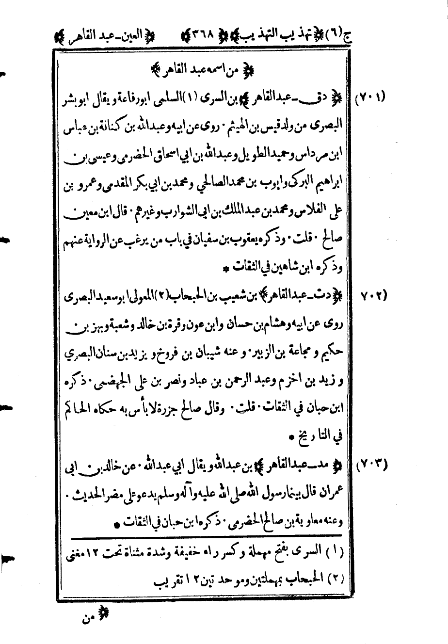 705 - "د ت عبد القاهر" بن شعيب بن الحبحاب2 المعولي أبو سعيد البصري روى عن أبيه وهشام بن حسان وابن عون وقره بن خالد وشعبة وبهز بن حكيم ومجاعة بن الزبير وعنه شيبان ابن فروخ ويزيد بن سنان البصري وزيد بن أخزم وعبد الرحمن بن عباد ونصر بن علي الجهضمي ذكره بن حبان في الثقات قلت وقال صالح جزرة لا بأس به حكاه الحاكم في التاريخ.