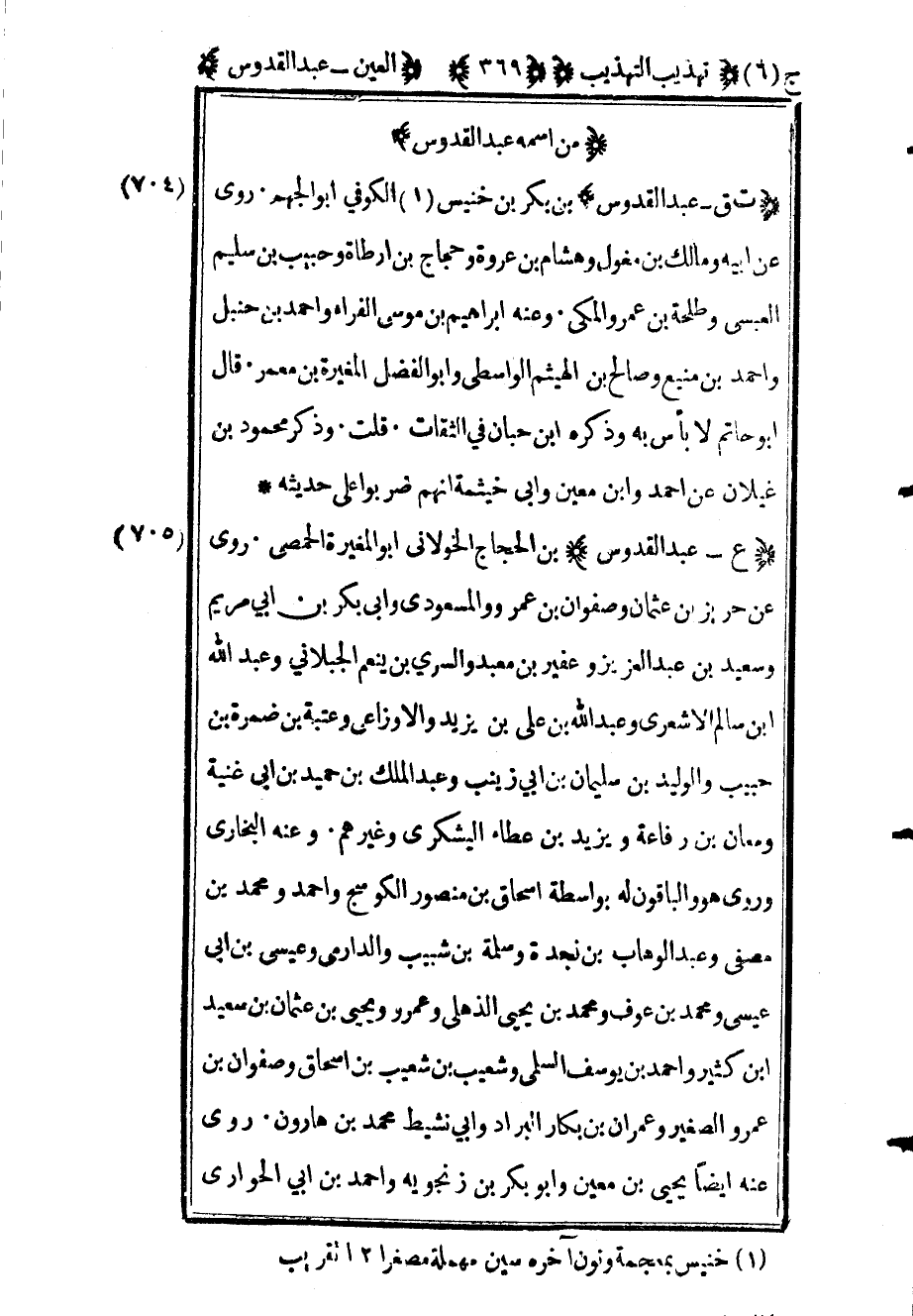 708 - "ع عبد القدوس" بن الحجاج الخولاني أبو المغيرة الحمصي روى عن حريز بن عثمان وصفوان بن عمرو والمسعودي وأبي بكر بن أبي مريم وسعيد بن عبد العزيز وعفير بن معبد والسري بن ينعم الجبلاني وعبد الله بن سالم الأشعري وعبد الله بن علي بن يزيد والأوزاعي وعتبة بن ضمرة بن حبيب والوليد بن سليمان بن أبي زينب وعبد الملك بن حميد بن أبي غنية ومعان بن رفاعة ويزيد بن عطاء اليشكري وغيرهم وعنه البخاري وروى هو والباقون له بواسطة إسحاق بن منصور الكوسج وأحمد ومحمد بن مصفى وعبد الوهاب بن نجدة وسلمة بن شبيب والدارمي وعيسى بن أبي عيسى ومحمد بن عوف ومحمد بن يحيى الذهلي وعمرو ويحيى ابن عثمان بن سعيد بن كثير وأحمد بن يوسف السلمي وشعيب بن شعيب بن إسحاق وصفوان ابن عمرو الصغير وعمران بن بكار البراد وأبي نشيط محمد بن هارون روى عنه أيضا يحيى بن معين وأبو بكر بن زنجويه وأحمد بن أبي الحواري