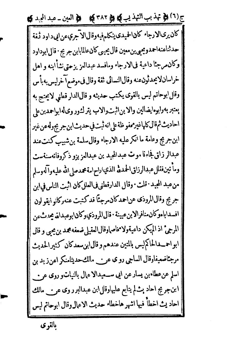 كان يرى الإرجاء كان الحميدي يتكلم فيه وقال الآجري عن أبي داود ثقة حدثنا عنه أحمد ويحيى بن معين قال يحيى كان عالما بابن جريج قال أبو داود وكان مرجئا داعية في الإرجاء وما فسد عبد العزيز حتى نشأ ابنه وأهل خراسان لا يحدثون عنه وقال النسائي ثقة وقال في موضع أخر ليس به بأس وقال أبو حاتم ليس بالقوي يكتب حديثه وقال الدارقطني لا يحتج به يعتبر به وأبوه أيضا لين والابن أثبت والأب يترك وروى له أبو أحمد بن علي أحاديث ثم قال كلها غير محفوظة على أنه ثبت في حديث بن جريج وله عن غير بن جريج وعامة ما أنكر عليه الإرجاء وقال سلمة بن شبيب كنت عند عبد الرزاق فجاءنا موت عبد المجيد بن عبد العزيز وذكر وفاته سنة ست ومائتين فقال عبد الرزاق الحمد الله الذي اراح أمة محمد صلى الله عليه وسلم من عبد المجيد قلت وقال الدارقطني في العلل كان أثبت الناس في بن جريج وقال المروذي عن أحمد كان مرجئا قد كتبت عنه وكانوا يقولون أفسد أباه وكان منافرا لابن عيينة قال المروذي وكان أبو عبد الله يحدث عن المرجىء إذا لم يكن داعية ولا مخاصما وقال العقيلي ضعفه محمد بن يحيى وقال أبو أحمد الحاكم ليس بالمتين عندهم وقال ابن سعد كان كثير الحديث مرجئا ضعيف وقال الساجي روى عن مالك حديثا منكرا عن زيد بن أسلم عن عطاء بن يسار عن أبي سعيد الأعمال بالنيات وروى عن ابن جريج أحاديث لم يتابع عليها وقال ابن عبد البر روى عن مالك أحاديث أخطأ فيها اشهرها خطأ حديث الأعمال وقال أبو حاتم ليس