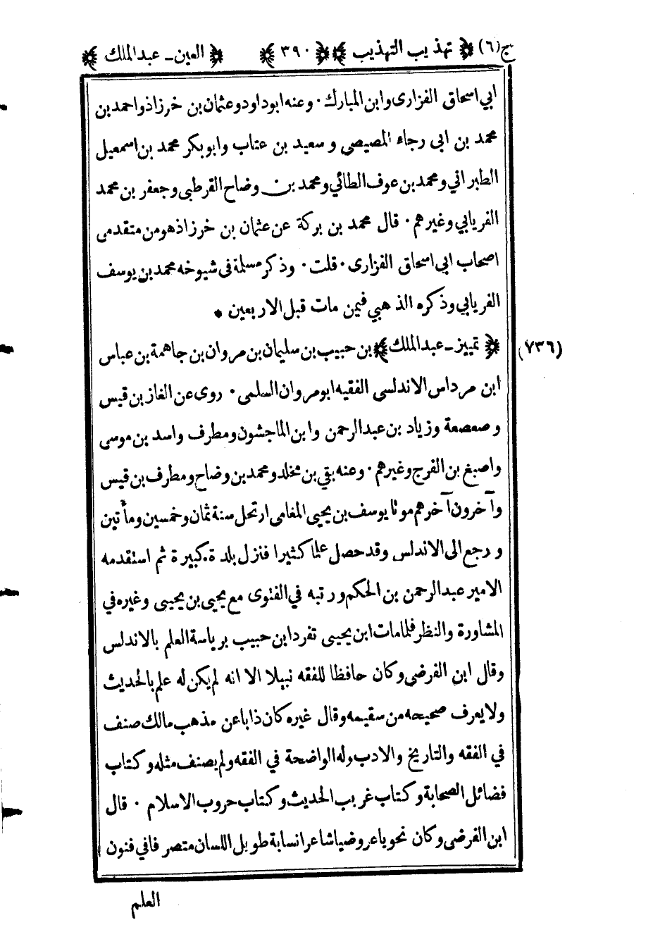 739 - "تمييز عبد الملك" بن حبيب بن سليمان بن مروان بن جاهمة بن عباس بن مرداس الأندلسي الفقيه أبو مروان السلمي روى عن الغاز بن قيس وصعصعة وزياد بن عبد الرحمن وابن الماجشون ومطرف وأسد بن موسى وأصبغ بن الفرج وغيرهم وعنه بقي بن مخلد ومحمد ابن وضاح ومطرف بن قيس وآخرون آخرهم موتا يوسف بن يحيى المغامي أرتحل سنة ثمان وخمسين ومائتين ورجع إلى الأندلس وقد حصل علما كثيرا فنزل بلده كبيرة ثم استقدمه الأمير عبد الرحمن بن الحكم ورتبه في الفتوى مع يحيى بن يحيى وغيره في المشاورة والنظر فلما مات بن يحيى تفرد بن حبيب برياسة العلم بالأندلس وقال ابن الفرضي وكان حافظا للفقيه نبيلا إلا أنه لم يكن له علم بالحديث ولا يعرف صحيحه من سقيمه وقال غيره كان ذابا عن مذهب مالك صنف في الفقه والتاريخ والأدب وله الواضحة في الفقه ولم يصنف مثله وكتاب فضائل الصحابة وكتاب غريب الحديث وكتاب حروب الإسلام قال ابن الفرضي وكان نحويا عروضيا شاعرا نسابة طويل اللسان متصرفا في فنون