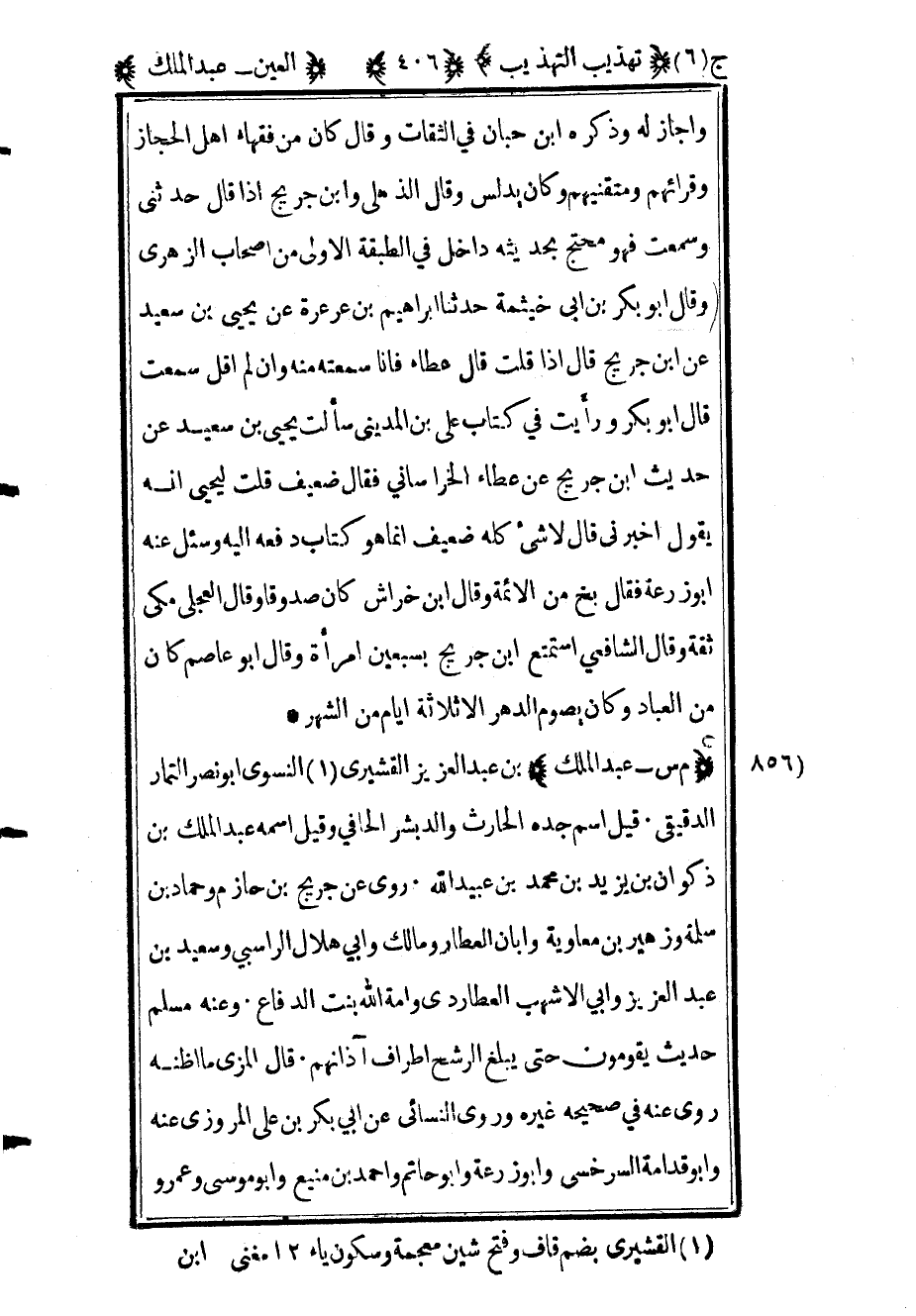جريج وابن أبي عروبة وقال عبد الوهاب بن همام عن ابن جريج لزمت عطاء سبع عشرة سنة وقال ابن عيينة سمعت أخي عبد الرزاق بن همام عن ابن جريج يقول ما دون العلم تدويني أحد وقال جالست عمرو بن دينار بعدما فرغت من عطاء سبع سنين وقال طلحة بن عمر المكي قلت لعطاء من نسأل بعدك قال هذا الفتى إن عاش وقال عطاء شاب أهل الحجاز بن جريج وقال علي بن المديني نظرت فإذا الإسناد تدور على ستة فذكرهم ثم قال فصار علم هؤلاء إلى من صنف في العلم منهم من أهل مكة عبد الملك بن جريج قال الوليد بن مسلم سألت الأوزاعي وغير واحد لمن طلبتم العلم فكلهم يقول لنفسي غير بن جريج فإنه قال طلبته للناس وقال علي بن المديني عن يحيى بن سعيد القطان بن جريج أثبت في نافع من مالك وقال أحمد بن جريج أثبت الناس في عطاء وقال أبو بكر بن خلاد عن يحيى بن سعيد كنا نسمي كتب بن جريج كتب الأمانة وأن لم يحدثك بها بن جريج من كتابه لم ينتفع به وقال الأثرم عن أحمد إذا قال ابن جريج قال فلان وقال فلان وأخبرت جاء مناكير وإذا قال أخبرني وسمعت فحسبك به وقال الميموني سمعت أبا عبد الله غير مرة يقول كان ابن جريج من أوعية العلم وقال المخراقي عن مالك كان ابن جريج حاطب ليل وقال عثمان الدارمي عن إسماعيل بن داود عن ابن معين ليس بشيء في الزهري وقال ابن أبي مريم عن ابن معين ثقة في كل ما روى عنه من الكتاب وقال جعفر بن عبد الواحد عن يحيى بن سعيد كان ابن جريج صدوقا فإذا قال حدثني فهو سماع وإذا قال أخبرني فهو قراءة وإذا قال قال فهو شبه الريح