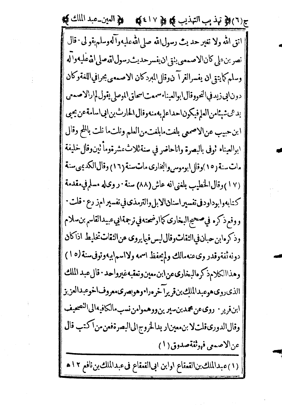 771 - "مق د ت عبد الملك" بن قريب1 بن عبد الملك بن علي بن أصمع بن مطهر بن رباح ابن عمرو الباهلي أبو سعيد الأصمعي البصري أحد الأعلام ويقال أن قريبا لقب واسمه عاصم وكنيته أبو بكر روى عن ابن عون وسليمان التيمي وعبد الرحمن بن أبي الزناد والحمادين والخليل بن أحمد وقره بن خالد وأبي الأشهب العطاردي ومالك بن أنس ومعتمر بن سليمان وأبي عمرو بن العلاء وخلق وعنه أبو عبيد القاسم بن سلام وأبو داود السبخي ونصر بن علي الجهضمي ومحمد بن الحسين بن أبي جميلة ويحيى بن معين ويعقوب بن سفيان