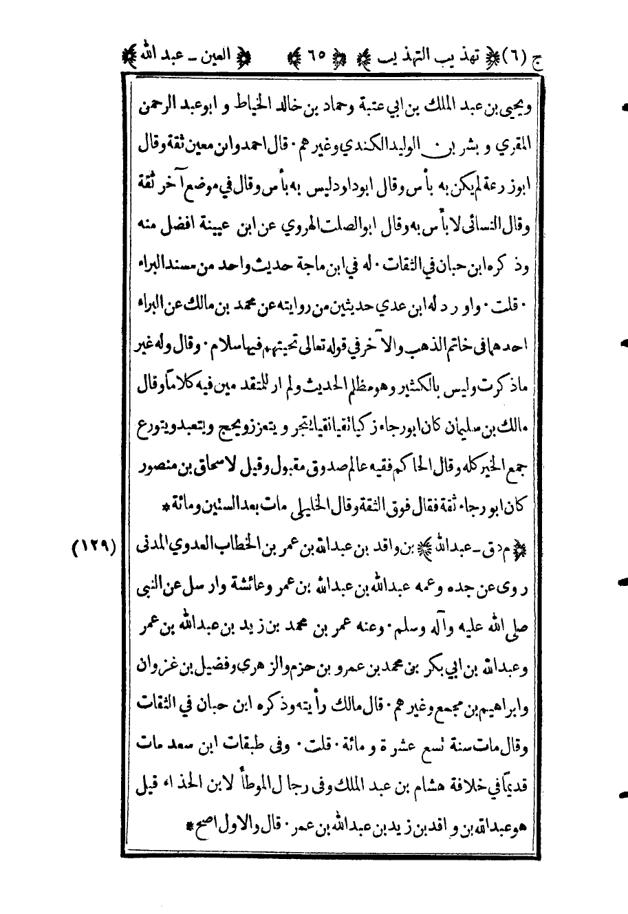 130 - "م د ق عبد الله" بن واقد بن عبد الله بن عمر بن الخطاب العدوي المدني روى عن جده وعنه عبد الله بن عبد الله بن عمر وعائشة وأرسل عن النبي صلى الله عليه وآله وسلم وعنه عن عمر بن محمد بن يزيد بن عبد الله بن عمر وعبد الله بن أبي بكر بن محمد بن عمرو بن حزم والزهري وفضيل بن غزوان وإبراهيم ب مجمع وغيرهم قال مالك رأيته وذكره ابن حبان فب الثقات وقال مات سنة تسع عشرة ومائة قلت وفي طبقات بن سعد مات قديما في خلافة هشام ابن عبد الملك وفي رجال الموطأ لابن الحذاء قيل هو عبد الله بن واقد بن زيد بن عبد الله بن عمر قال والأول أصح.