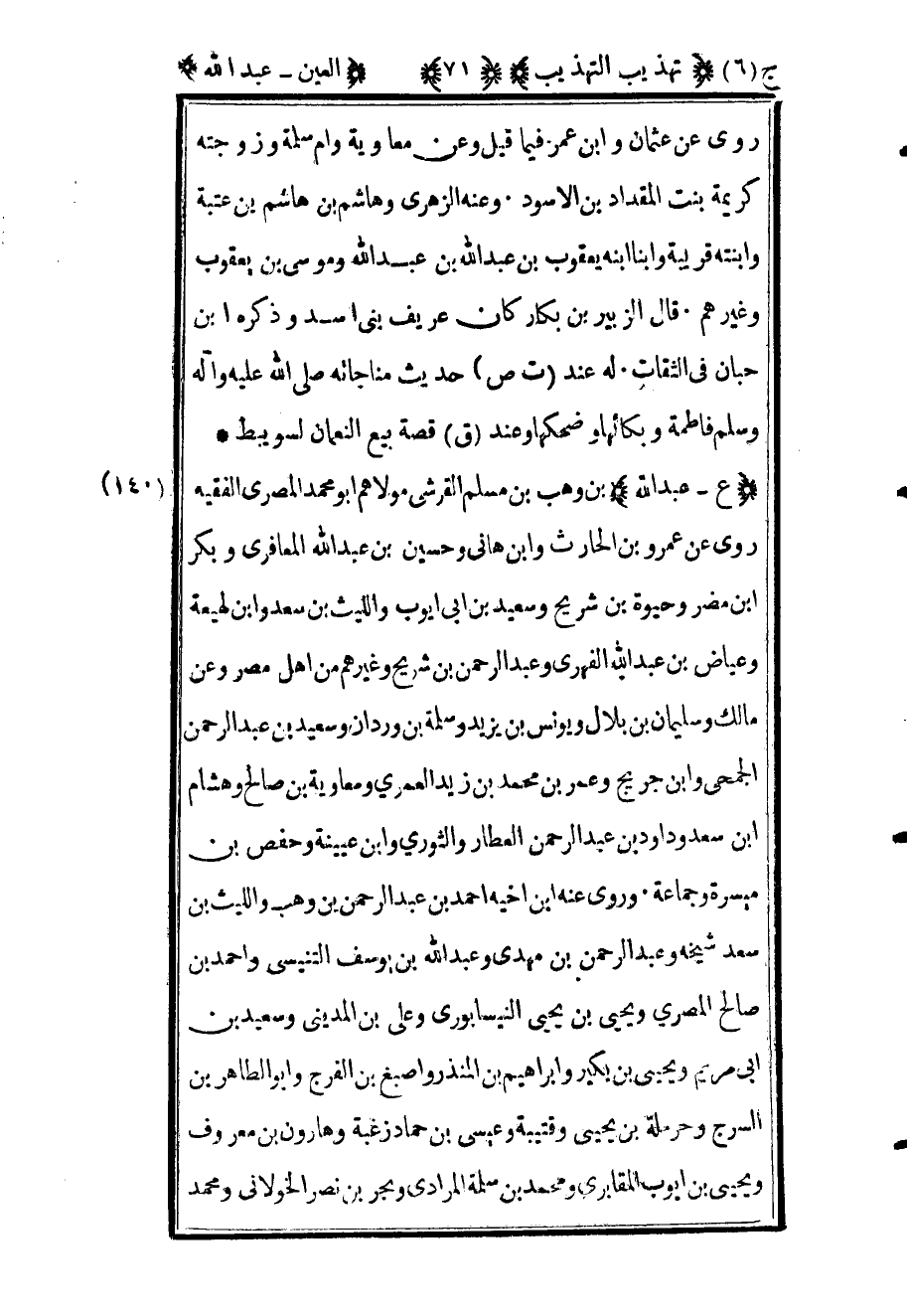141 - "ع عبد الله" بن وهب بن مسلم القرشي مولاهم أبو محمد المصري الفقيه روى عن عمرو بن الحارث وابن هانئ وحسين بن عبد الله المعافري وبكر بن مضر وحيوة بن شريح وسعيد بن أبي أيوب والليث بن سعد وابن لهيعة وعياض بن عبد الله الفهري وعبد الرحمن بن شريح وغيرهم من أهل مصر وعن مالك وسليمان بن بلال ويونس بن يزيد وسلمة بن وردان وسعيد بن عبد الرحمن الجمحي وابن جريج وعمر بن محمد بن زيد العمري ومعاوية بن صالح وهشام بن سعد وداود بن عبد الرحمن العطار والثوري وابن عيينة وحفص بن ميسرة وجماعة وروى عنه ابن أخيه أحمد بن عبد الرحمن بن وهب والليث بن سعد شيخه وعبد الرحمن بن مهدي وعبد الله بن يوسف التنيسي وأحمد بن صالح المصري ويحيى بن يحيى النيسابوري وعلي ابن المديني وسعيد بن أبي مريم ويحيى بن بكير وإبراهيم بن المنذر وأصبغ بن الفرج وأبو الطاهر ابن السرج وحرملة بن يحيى وقتيبة وعيسى بن حماد زغبة وهارون بن معروف ويحيى بن أيوب المقابري ومحمد بن سلمة وبحر بن نصر الخولاني ومحمد