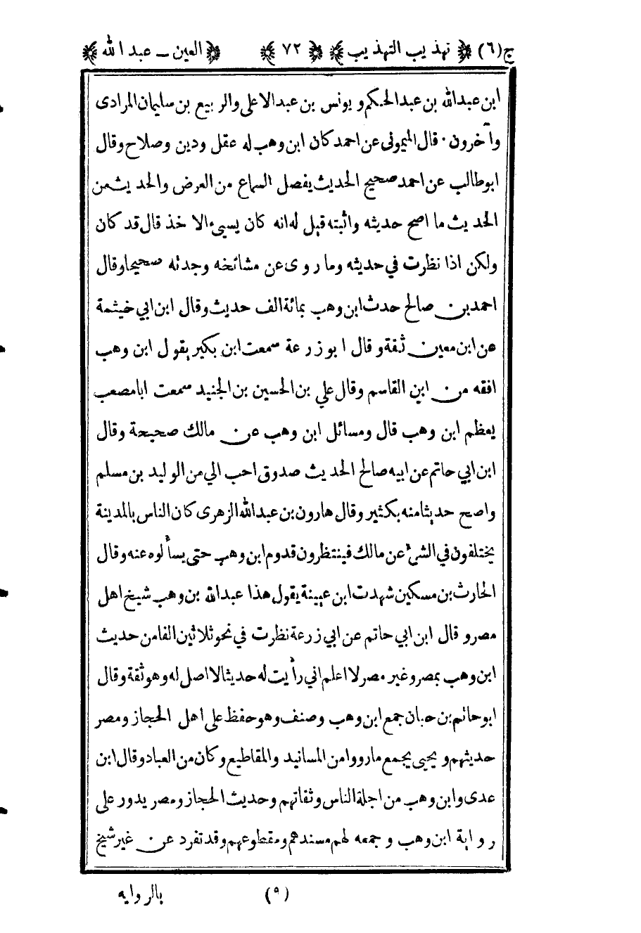 ابن عبد الله بن عبد الحكم ويونس بن عبد الأعلى والربيع بن سليمان المرادي وآخرون قال الميموني عن أحمد كان ابن وهب له عقل ودين وصلاح وقال أبو طالب عن أحمد صحيح الحديث يفصل السماع من العرض والحديث ما أصح حديثه وأثبته قيل له أنه كان يسيئ الأخذ قال قد كان ولكن إذا نظرت في حديثه وما روى عن مشائخه وجدته صحيحا وقال أحمد بن صالح حدث بن وهب بمائة ألف حديث وقال ابن أبي خيثمة عن ابن معين ثقة وقال أبو زرعة سمعت ابن بكير يقول ابن وهب أفقه من بن القاسم وقال علي بن الحسين بن الجنيد سمعت أبا مصعب يعظم بن وهب قال ومسائل بن وهب عن مالك صحيحة وقال ابن أبي حاتم عن أبيه صالح الحديث صدوق أحب إلي من الوليد بن مسلم وأصح حديثا منه بكثير وقال هارون بن عبد الله الزهري كان الناس بالمدينة يختلفون في الشيء عن مالك فينتظرون قدوم بن وهب حتى يسألوه عنه وقال الحارث بن مسكين شهدت بن عيينة يقول هذا عبد الله بن وهب شيخ أهل مصر وقال ابن أبي حاتم عن أبي زرعة نظرت في نحو ثلاثين ألفا من حديث بن وهب بمصر وغير مصر لا أعلم إني رأيت له حديثا لا أصل له وهو ثقة وقال أبو حاتم بن حبان جمع بن وهب وصنف وهو حفظ على أهل الحجاز ومصر حديثهم ويحيى يجمع ما رواه من المسانيد والمقاطيع وكان من العباد وقال ابن عدي وابن وهب من أجلة الناس وثقاتهم وحديث الحجاز ومصر يدور على رواية ابن وهب وجمعه لهم مسندهم ومقطوعهم وقد تفرد عن غير شيخ