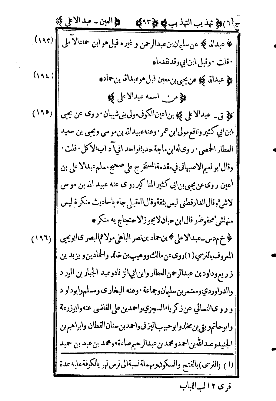 197 - "خ م د س عبد الأعلى" بن حماد بن نصر الباهلي مولاهم البصري أبو يحيى المعروف بالنرسي1 روى عن مالك ووهيب بن خالد والحمادين ويزيد بن زريع وداود بن عبد الرحمن العطار وابن أبي الزناد وعبد الجبار بن الورد والداروردي ومعتمر بن سليمان وجماعة وعنه البخاري ومسلم وأبو داود وروى النسائي عن زكريا السجزي وأحمد بن علي القاضي عنه وأبو زرعة وأبو حاتم وبقي بن مخلد وأبو حبيب اليزني وأحمد بن سنان القطان وإبراهيم بن الجنيد وعبد الله بن أحمد ومحمد بن عبد الرحيم صاعقة ومحمد بن عبد بن حميد
