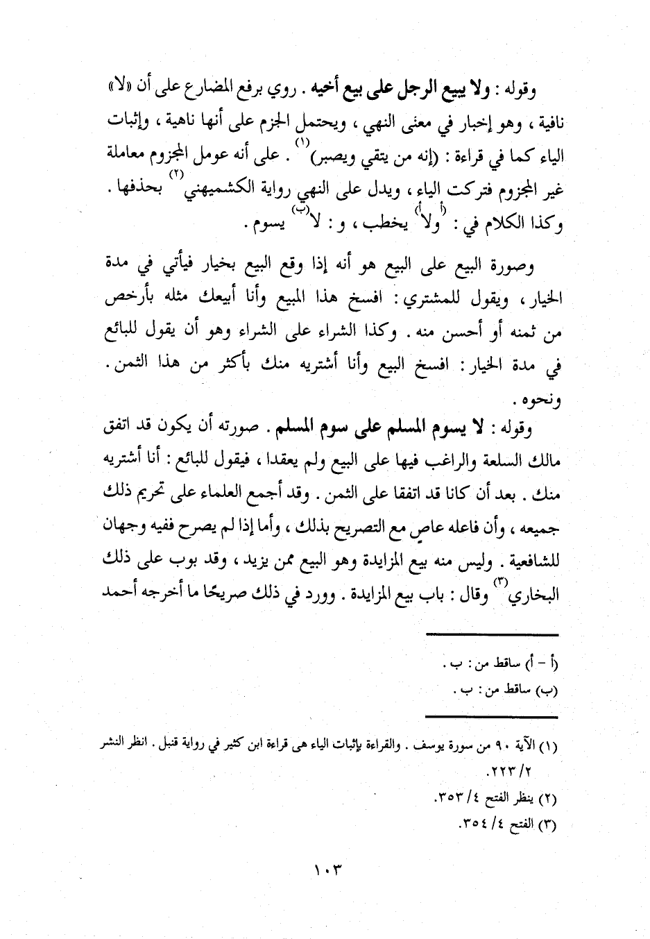 وقوله: ولا يبيع الرجل على بيع أخيه. روي برفع المضارع على أن "لا" نافية، وهو إخبار في معنى النهي، ويحتمل الجزم على أنها ناهية، وإثبات الياء كما في قراءة: (إنه من يتقي ويصبر) (¬1). على أنه عومل المجزوم معاملة غير المجزوم فتركت الياء، ويدل على النهي رواية الكشميهني (¬2) بحذفها. وكذا الكلام في: (أولا أ) يخطب، و: لا (ب) يسوم.