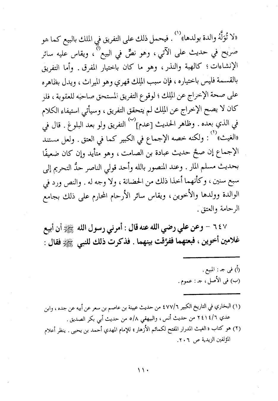 647 - وعن علي رضي الله عنه قال: أمرني رسول الله - صلى الله عليه وسلم - أن أبيع غلامين أخوين، فبعتهما ففرَّقت بينهما. فذكرت ذلك للنبي - صلى الله عليه وسلم - فقال: