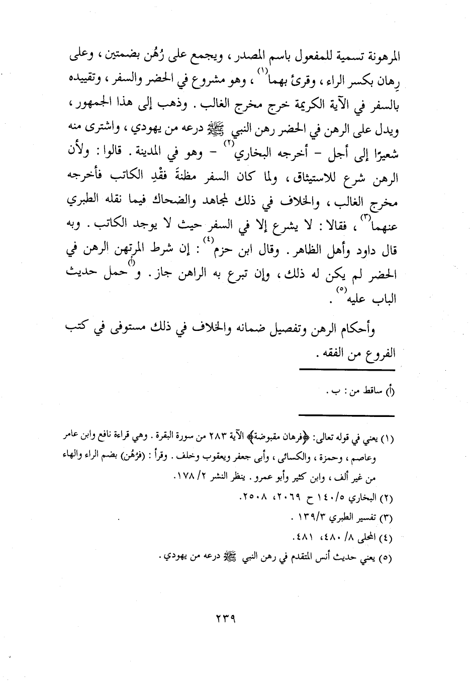 المرهونة تسمية للمفعول باسم المصدر، ويجمع على رُهُن بضمتين، وعلى رِهان بكسر الراء، وقرئ بهما (¬1)، وهو مشروع في الحضر والسفر، وتقييده بالسفر في الآية الكريمة خرج مخرج الغالب. وذهب إلى هذا الجمهور، ويدل على الرهن في الحضر رهن النبي - صلى الله عليه وسلم - درعه من يهودي، واشترى منه شعيرًا إلى أجل -أخرجه البخاري (¬2) - وهو في المدينة. قالوا: ولأن الرهن شرع للاستيثاق، ولما كان السفر مظنةَ فقْدِ الكاتب فأخرجه مخرج الغالب، والخلاف في ذلك لمجاهد والضحاك فيما نقله الطبري عنهما (¬3)، فقالا: لا يشرع إلا في السفر حيث لا يوجد الكاتب. وبه قال داود وأهل الظاهر. وقال ابن حزم (¬4): إن شرط المرتهن الرهن في الحضر لم يكن له ذلك، وإن تبرع به الراهن جاز. و (أ) حمل حديث الباب عليه (¬5).