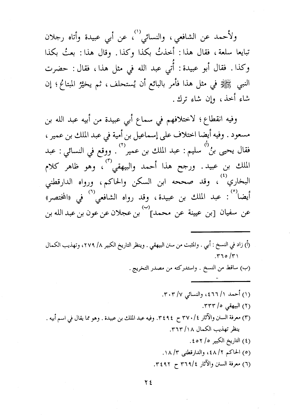 وفيه انقطاع؛ لاختلافهم في سماع أبي عبيدة من أبيه عبد الله بن مسعود. وفيه أيضًا اختلاف على إسماعيل بن أمية في عبد الملك بن عمير، فقال يحيى بنُ (أ) سليم: عبد الملك بن عمير (¬2). ووقع في النسائي: عبد الملك بن عبيد. ورجح هذا أحمد والبيهقي (¬3)، وهو ظاهر كلام البخاري (¬4)، وقد صححه ابن السكن والحاكم، ورواه الدارقطني أيضًا (¬5): عبد الملك بن عبيدة، وقد رواه الشافعي (¬6) في "المختصر" عن سفيان [بن عيينة عن محمد] (ب) بن عجلان عن عون بن عبد الله بن