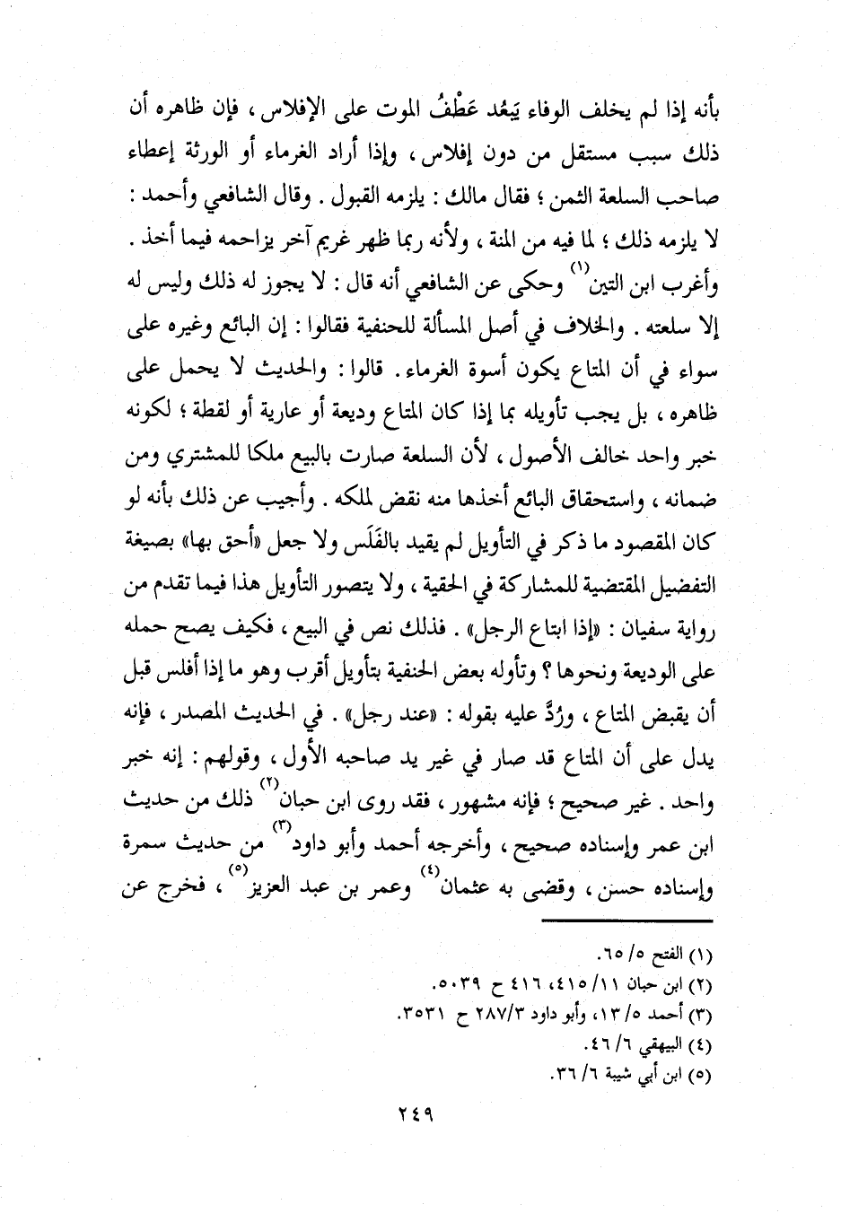 بأنه إذا لم يخلف الوفاء يَبعُد عَطْفُ الموت على الإفلاس، فإن ظاهره أن ذلك سبب مستقل من دون إفلاس، وإذا أراد الغرماء أو الورثة إعطاء صاحب السلعة الثمن؛ فقال مالك: يلزمه القبول. وقال الشافعي وأحمد: لا يلزمه ذلك؛ لما فيه من المنة، ولأنه ربما ظهر غريم آخر يزاحمه فيما أخذ. وأغرب ابن التين (¬1) وحكى عن الشافعي أنه قال: لا يجوز له ذلك وليس له إلا سلعته. والخلاف في أصل المسألة للحنفية فقالوا: إن البائع وغيره على سواء في أن المتاع يكون أسوة الغرماء. قالوا: والحديث لا يحمل على ظاهره، بل يجب تأويله بما إذا كان المتاع وديعة أو عارية أو لقطة؛ لكونه خبر واحد خالف الأصول، لأن السلعة صارت بالبيع ملكا للمشتري ومن ضمانه، واستحقاق البائع أخذها منه نقض لملكه. وأجيب عن ذلك بأنه لو كان المقصود ما ذكر في التأويل لم يقيد بالفَلَس ولا جعل "أحق بها" بصيغة التفضيل المقتضية للمشاركة في الحقية، ولا يتصور التأويل هذا فيما تقدم من رواية سفيان: "إذا ابتاع الرجل". فذلك نص في البيع، فكيف يصح حمله على الوديعة ونحوها؟ وتأوله بعض الحنفية بتأويل أقرب وهو ما إذا أفلس قبل أن يقبض المتاع، ورُدَّ عليه بقوله: "عند رجل". في الحديث المصدر، فإنه يدل على أن المتاع قد صار في غير يد صاحبه الأول، وقولهم: إنه خبر واحد. غير صحيح، فإنه مشهور، فقد روى ابن حبان (¬2) ذلك من حديث ابن عمر وإسناده صحيح، وأخرجه أحمد وأبو داود (¬3) من حديث سمرة وإسناده حسن، وقضى به عثمان (¬4) وعمر بن عبد العزيز (¬5)، فخرج عن