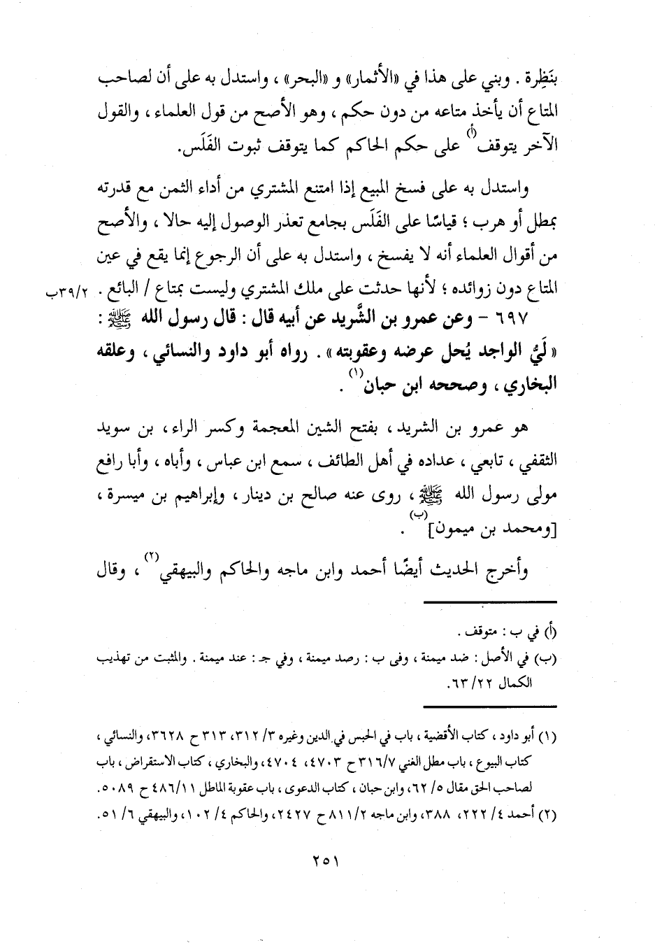697 - وعن عمرو بن الشَّريد عن أبيه قال: قال رسول الله - صلى الله عليه وسلم -: "لَيُّ الواجد يُحل عرضه وعقوبته". رواه أبو داود والنسائي، وعلقه البخاري، وصححه ابن حبان (¬1).