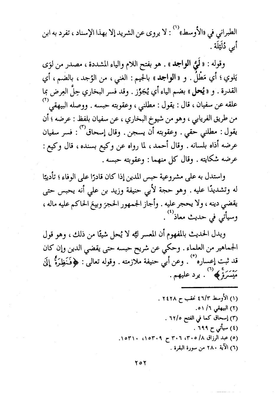 ويدل الحديث بالمفهوم أن المعسر ليُّه لا يُحل شيئًا من ذلك، وهو قول الجماهير من العلماء. وحكي عن شريح حبسه حتى يقضي الدين وإن كان قد ثبت إعساره (¬5). وعن أبي حنيفة ملازمته. وقوله تعالى: {فَنَظِرَةٌ إِلَى مَيْسَرَةٍ} (¬6). رد عليهم.