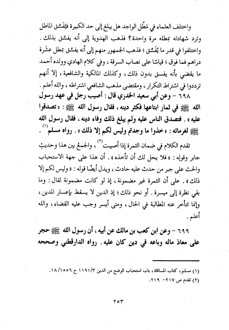 698 - وعن أبي سعيد الخدري قال: أصيب رجل في عهد رسول الله - صلى الله عليه وسلم - في ثمار ابتاعها فكثر دينه، فقال رسول الله - صلى الله عليه وسلم -: "تصدقوا عليه". فتصدق الناس عليه ولم يبلغ ذلك وفاء دينه، فقال رسول الله - صلى الله عليه وسلم - لغرمائه: "خذوا ما وجدتم وليس لكم إلا ذلك". رواه مسلم (¬1).