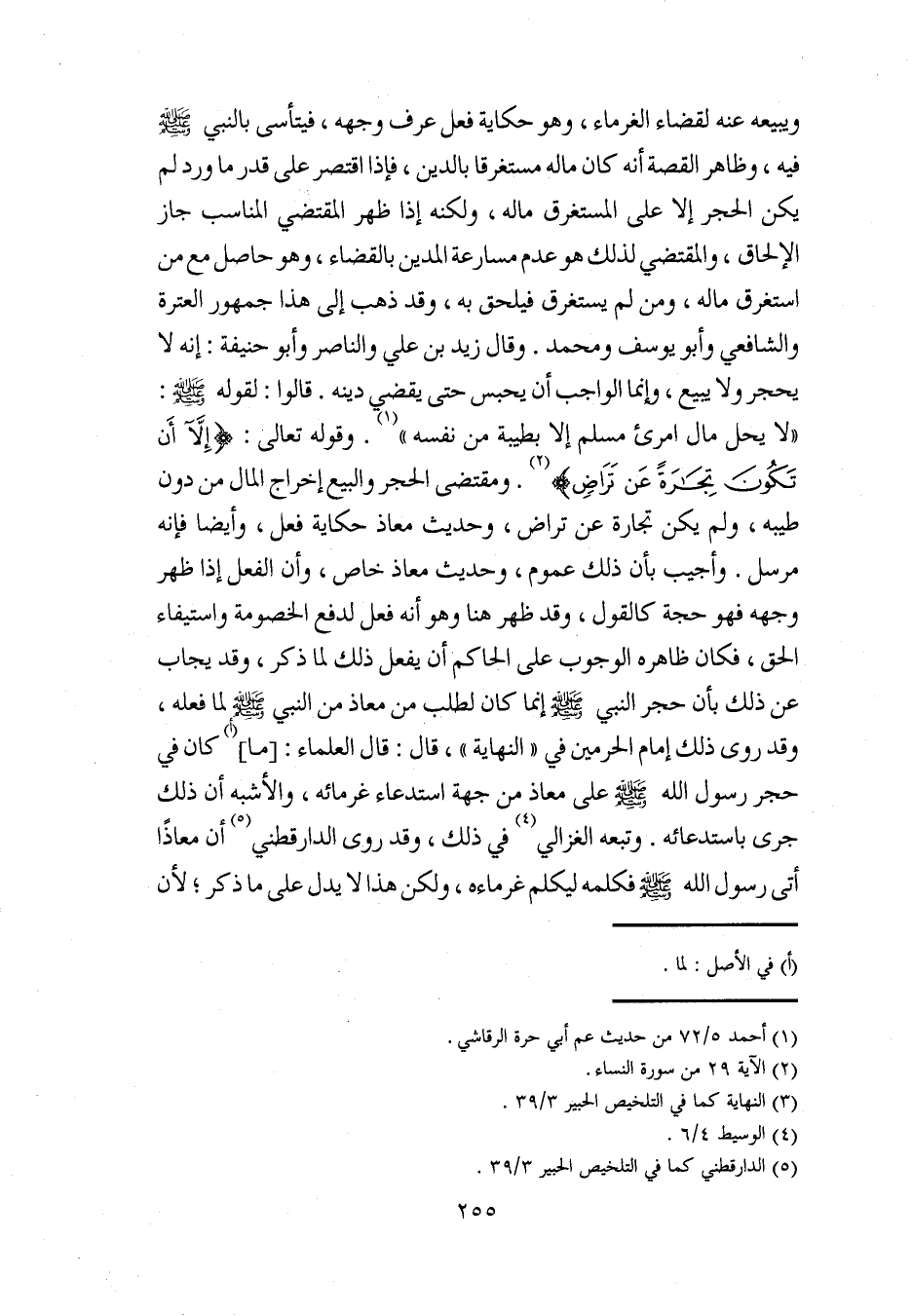 ويبيعه عنه لقضاء الغرماء، وهو حكاية فعل عرف وجهه، فيتأسى بالنبي - صلى الله عليه وسلم - فيه، وظاهر القصة أنه كان ماله مستغرقا بالدين، فإذا اقتصر على قدر ما ورد لم يكن الحجر إلا على المستغرق ماله، ولكنه إذا ظهر المقتضي المناسب جاز الإلحاق، والمقتضي لذلك هو عدم مسارعة المدين بالقضاء، وهو حاصل مع من استغرق ماله، ومن لم يستغرق فيلحق به، وقد ذهب إلى هذا جمهور العترة والشافعي وأبو يوسف ومحمد. وقال زيد بن علي والناصر وأبو حنيفة: إنه لا يحجر ولا يبيع، وإنما الواجب أن يحبس حتى يقضي دينه. قالوا: لقوله - صلى الله عليه وسلم -: "لا يحل مال امرئ مسلم إلا بطيبة من نفسه" (¬1). وقوله تعالى: {إلا أَنْ تَكُونَ تِجَارَةً عَنْ تَرَاضٍ} (¬2). ومقتضى الحجر والبيع إخراج المال من دون طيبه، ولم يكن تجارة عن تراض، وحديث معاذ حكاية فعل، وأيضًا فإنه مرسل. وأجيب بأن ذلك عموم، وحديث معاذ خاص، وأن الفعل إذا ظهر وجهه فهو حجة كالقول، وقد ظهر هنا وهو أنه فعل لدفع الخصومة واستيفاء الحق، فكان ظاهره الوجوب على الحاكم أن يفعل ذلك لما ذكر، وقد يجاب عن ذلك بأن حجر النبي - صلى الله عليه وسلم - إنما كان لطلب من معاذ من النبي - صلى الله عليه وسلم - لما فعله، وقد روى ذلك إمام الحرمين في "النهاية" (¬3)، قال: قال العلماء: [ما] (أ) كان في حجر رسول الله - صلى الله عليه وسلم - على معاذ من جهة استدعاء غرمائه، والأشبه أن ذلك جرى باستدعائه. وتبعه الغزالي (¬4) في ذلك، وقد روى الدارقطني (¬5) أن معاذًا أتى رسول الله - صلى الله عليه وسلم - فكلمه ليكلم غرماءه، ولكن هذا لا يدل على ما ذكر؛ لأن