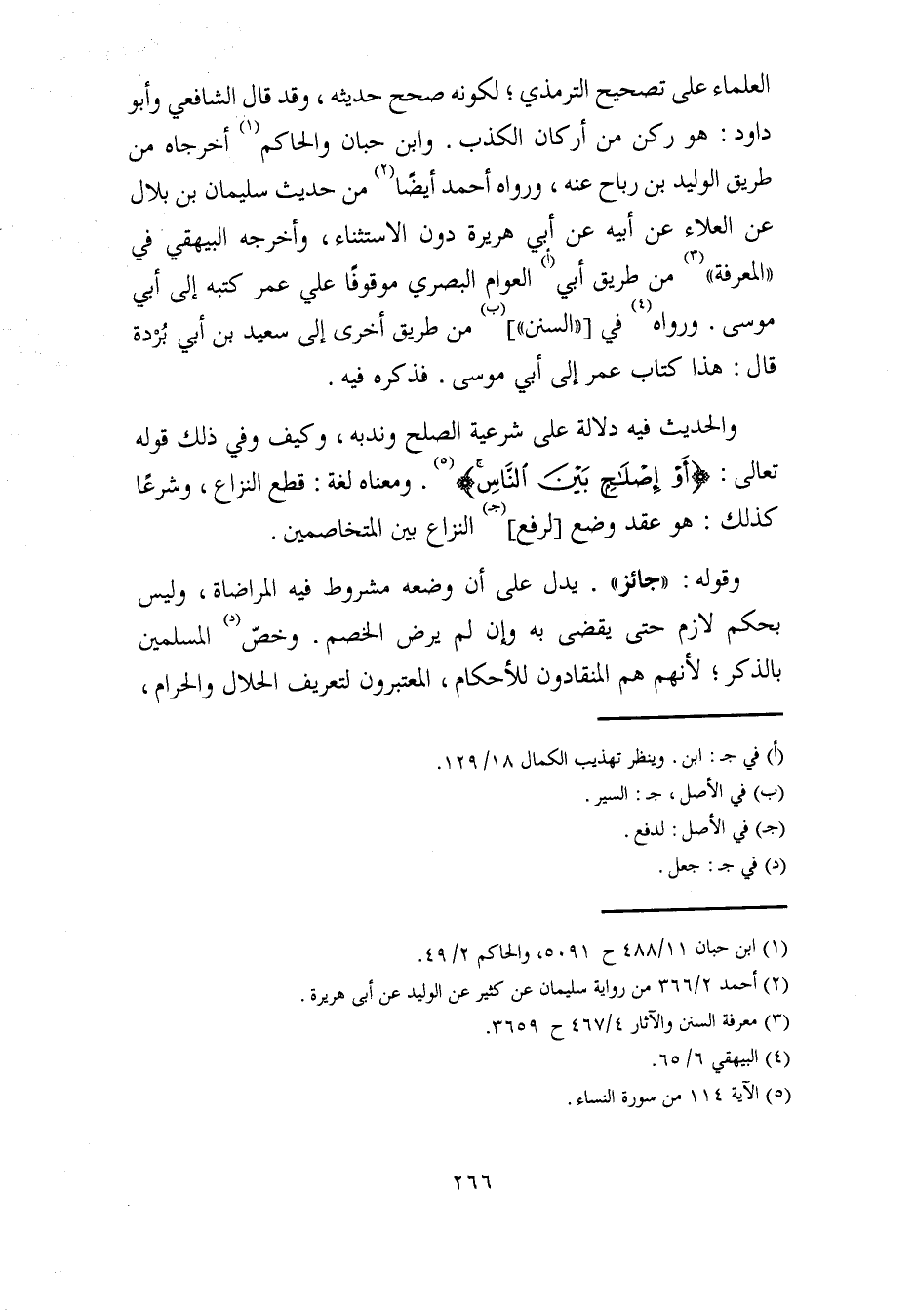 والحديث فيه دلالة على شرعية الصلح وندبه، وكيف وفي ذلك قوله تعالى: {أَوْ إِصْلَاحٍ بَيْنَ النَّاسِ} (¬5). ومعناه لغة: قطع النزاع، وشرعًا كذلك: هو عقد وضع [لرفع] (جـ) النزاع بين المتخاصمين.