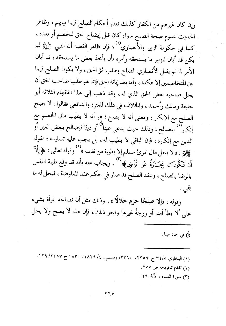 وإن كان غيرهم من الكفار كذلك تعتبر أحكام الصلح فيما بينهم، وظاهر الحديث عموم صحة الصلح سواء كان قبل إيضاح الحق للخصم أو بعده، كما في حكومة الزُّبير والأنصاري (¬1)؛ فإن ظاهر القصة أن النَّبيَّ - صلى الله عليه وسلم - لم يكن قد أبان للزبير ما يستحقه وأمره بأن يأخذ بعض ما يستحقه، ثم أبان الأمر لما لم يقبل الأنصاري الصلح وطلب مُرَّ الحق، ولا يكون الصلح فيما بين المتخاصمين إلَّا هكذا، وأمَّا بعد إبانة الحق فإنَّما هو طلب صاحب الحق أن يحل صاحبه بعض الحق الذي له، وقد ذهب إلى هذا الفقهاء الثلاثة أبو حنيفة ومالك وأحمد، والخلاف في ذلك للعترة والشّافعيّ فقالوا: لا يصح الصلح مع الإنكار، ومعنى أنَّه لا يصح، هو اُنه لا يطيب مال الخصم مع إنكار (1) المصالح، وذلك حيث يدعي عينا (أ) أو دينًا فيصالح ببعض العين أو الدين مع إنكاره، فإن الباقي لا يطيب له، بل يجب عليه تسليمه، لقوله - صلى الله عليه وسلم -: "لا يحل مال امرئ مسلم إلَّا بطيبة من نفسه" (¬2) وقوله تعالى: {إلا أَنْ تَكُونَ تِجَارَةً عَنْ تَرَاضٍ} (¬3). ويجاب عنه بأنه قد وقع طيبة النَّفس بالرضا بالصلح، وعقد الصلح قد صار في حكم عقد المعاوضة، فيحل له ما بقي.