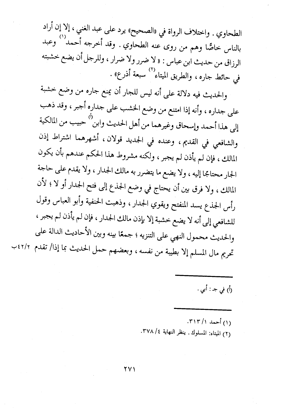 الطحاوي. واختلاف الرواة في "الصَّحيح" يرد على عبد الغني، إلَّا إن أراد بالنَّاس خاصًّا وهم من روى عنه الطحاوي. وقد أخرجه أحمد (¬1) وعبد الرَّزاق من حديث ابن عباس: "لا ضرر ولا ضرار، وللرجل أن يضع خشبته في حائط جاره، والطريق الميتاء (¬2) سبعة أذرع".