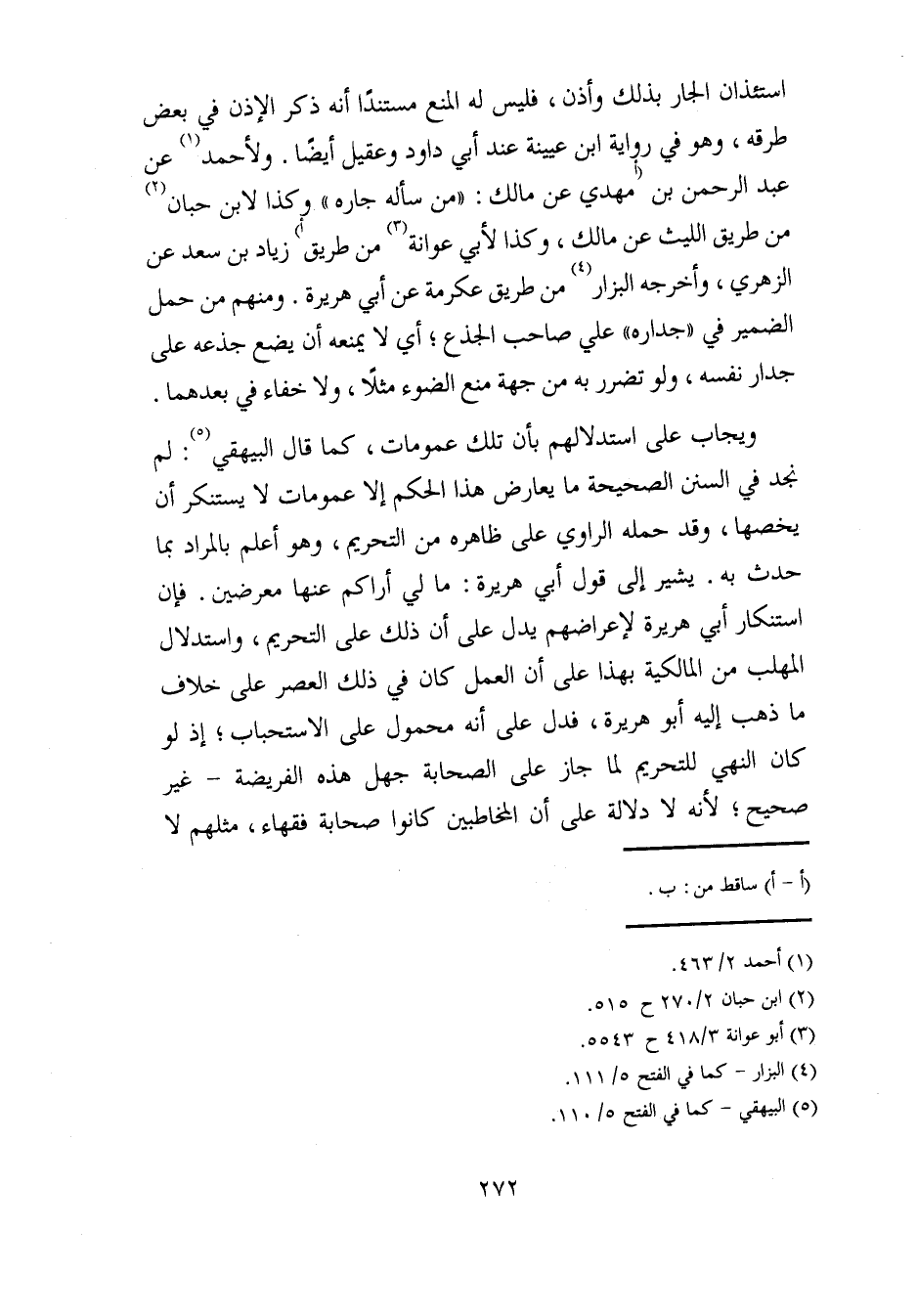 استئذان الجار بذلك وأذن، فليس له المنع مستندًا أنَّه ذكر الإذن في بعض طرقه، وهو في رواية ابن عيينة عند أبي داود وعقيل أيضًا. ولأحمد (¬1) عن عبد الرحمن بن (أمهدي عن مالك: "من سأله جاره" وكذا لابن حبان (¬2) من طريق اللَّيث عن مالك، وكذا لأبي عوانة (¬3) من طريق أ) زياد بن سعد عن الزُّهريّ، وأخرجه البزار (¬4) من طريق عكرمة عن أبي هريرة. ومنهم من حمل الضمير في "جداره" علي صاحب الجذع؛ أي لا يمنعه أن يضع جذعه على جدار نفسه، ولو تضرر به من جهة منع الضوء مثلًا، ولا خفاء في بعدهما.
