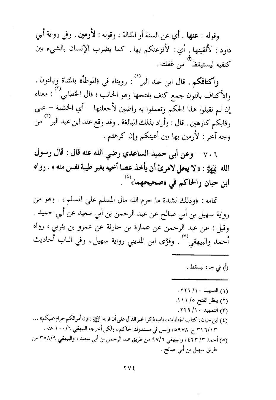 تمامه: "وذلك لشدة ما حرم الله مال المسلم على المسلم". وهو من رواية سهيل بن أبي صالح عن عبد الرحمن بن أبي سعيد عن أبي حميد. وقيل: عن عبد الرحمن عن عمارة بن حارثة عن عمرو بن يثربي، رواه أحمد والبيهقيّ (¬5). وقوَّى ابن المديني رواية سهيل، وفي الباب أحاديث