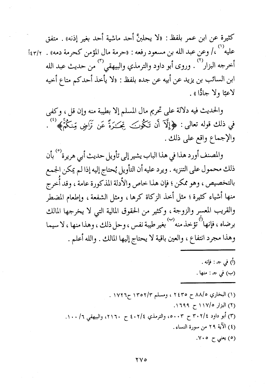 كثيرة عن ابن عمر بلفظ: "لا يحلبنَّ أحد ماشية أحد بغير إذنه". متَّفقٌ عليه (¬1)، وعن عبد الله بن مسعود رفعه: "حرمة مال المؤمن كحرمة دمه". أخرجه البزار (¬2). وروى أبو داود والترمذي والبيهقيّ (¬3) من حديث عبد الله بن السَّائب بن يزيد عن أبيه عن جده بلفظ: "لا يأخذ أحدكم متاع أخيه لاعبًا ولا جادًّا".