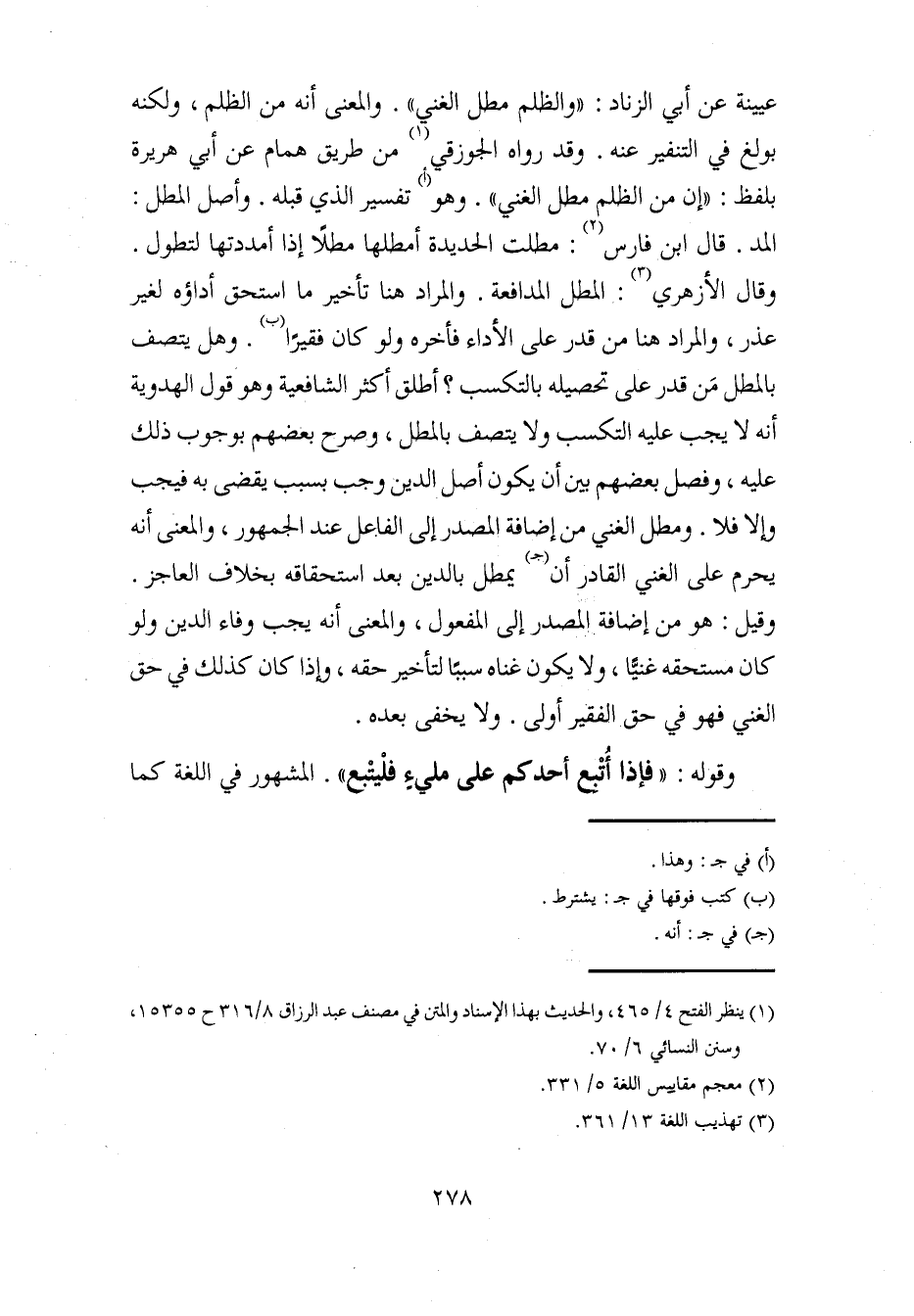 عيينة عن أبي الزناد: "والظلم مطل الغني". والمعنى أنَّه من الظلم، ولكنه بولغ في التنفير عنه. وقد رواه الجوزقي (¬1) من طريق همام عن أبي هريرة بلفظ: "إن من الظلم مطل الغني". وهو (أ) تفسير الذي قبله. وأصل المطل: المد. قال ابن فارس (¬2): مطلت الحديدة أمطلها مطلًا إذا أمددتها لتطول. وقال الأزهري (¬3): المطل المدافعة. والمراد هنا تأخير ما استحق أداؤه لغير عذر، والمراد هنا من قدر على الأداء فأخره ولو كان فقيرًا (5). وهل يتصف بالمطل مَن قدر على تحصيله بالتكسب؟ أطلق أكثر الشَّافعية وهو قول الهدوية أنَّه لا يجب عليه التكسب ولا يتصف بالمطل، وصرح بعضهم بوجوب ذلك عليه، وفصل بعضهم بين أن يكون أصل الدين وجب بسبب يقضي به فيجب وإلا فلا. ومطل الغني من إضافة المصدر إلى الفاعل عند الجمهور، والمعنى أنَّه يحرم على الغني القادر أن (جـ) يمطل بالدين بعد استحقاقه بخلاف العاجز.
