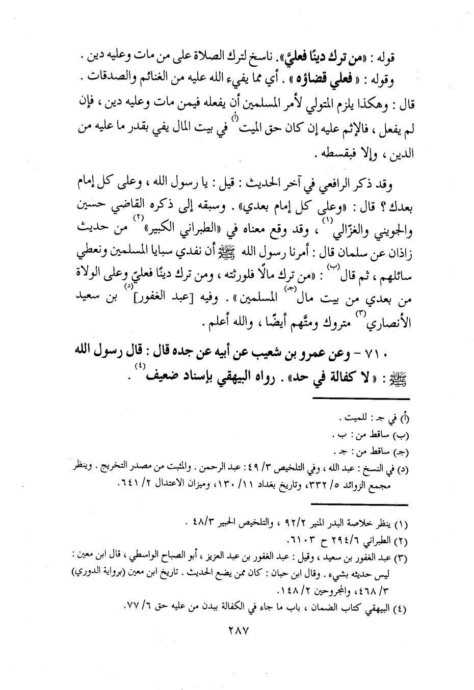 710 - وعن عمرو بن شعيب عن أبيه عن جده قال: قال رسول الله - صلى الله عليه وسلم -: "لا كفالة في حد". رواه البيهقي بإسناد ضعيف (¬4).