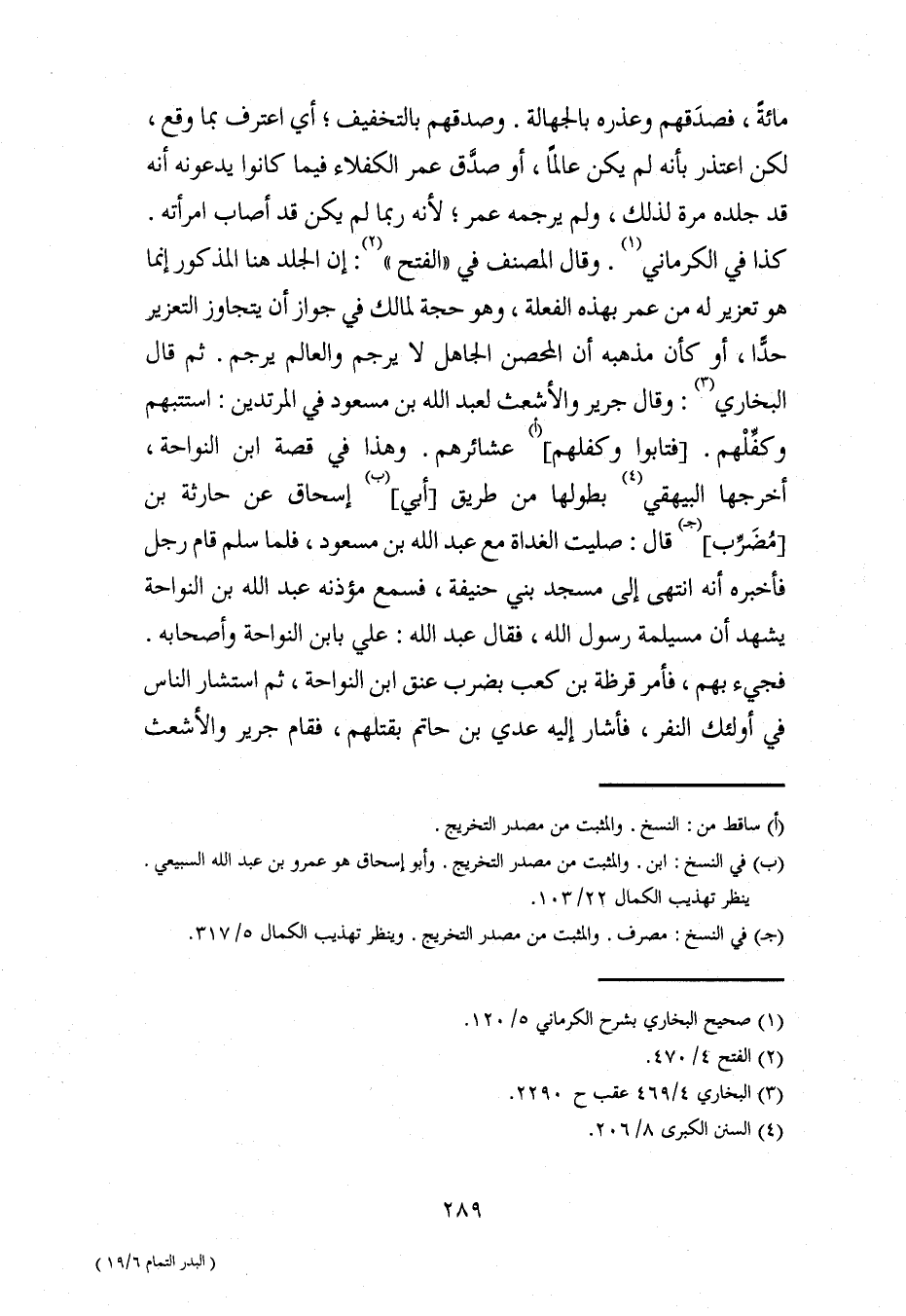 مائةً، فصدَقهم وعذره بالجهالة. وصدقهم بالتخفيف؛ أي اعترف بما وقع، لكن اعتذر بأنه لم يكن عالمًا، أو صدَّق عمر الكفلاء فيما كانوا يدعونه أنَّه قد جلده مرَّة لذلك، ولم يرجمه عمر؛ لأنَّه ربما لم يكن قد أصاب امرأته. كذا في الكرماني (¬1). وقال المصنف في "الفتح" (¬2): إن الجلد هنا المذكور إنَّما هو تعزير له من عمر بهذه الفعلة، وهو حجة لمالك في جواز أن يتجاوز التعزير حدًّا، أو كأن مذهبه أن المحصن الجاهل لا يرجم والعالم يرجم. ثم قال البُخاريّ (¬3): وقال جرير والأشعث لعبد الله بن مسعود في المرتدين: استتبهم وكفِّلْهم. [فتابوا وكفلهم] (أ) عشائرهم. وهذا في قصة ابن النواحة، أخرجها البيهقي (¬4) بطولها من طريق [أبي] (ب) إسحاق عن حارثة بن [مُضَرِّب] (جـ) قال: صليت الغداة مع عبد الله بن مسعود، فلما سلم قام رجل فأخبره أنَّه انتهى إلى مسجد بني حنيفة، فسمع مؤذنه عبد الله بن النواحة يشهد أن مسيلمة رسول الله، فقال عبد الله: علي بابن النواحة وأصحابه. فجيء بهم، فأمر قرظة بن كعب بضرب عنق ابن النواحة، ثم استشار النَّاس في أولئك النفر، فأشار إليه عدي بن حاتم بقتلهم، فقام جرير والأشعث