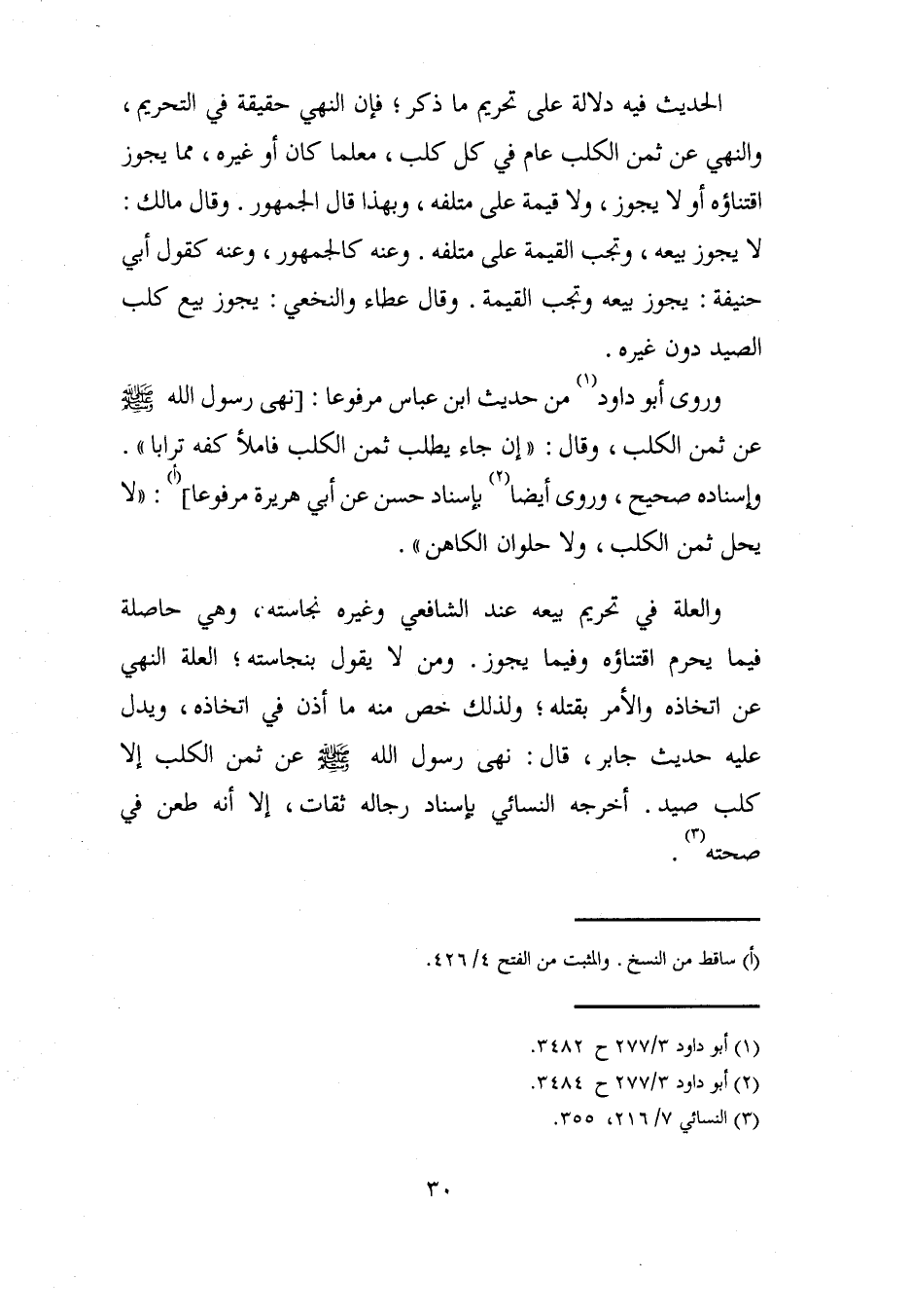 والعلة في تحريم بيعه عند الشافعي وغيره نجاسته، وهي حاصلة فيما يحرم اقتناؤه وفيما يجوز. ومن لا يقول بنجاسته؛ العلة النهي عن اتخاذه والأمر بقتله؛ ولذلك خص منه ما أذن في اتخاذه، ويدل عليه حديث جابر، قال: نهى رسول الله - صلى الله عليه وسلم - عن ثمن الكلب إلا كلب صيد. أخرجه النسائي بإسناد رجاله ثقات، إلا أنه طعن في صحته (¬3).
