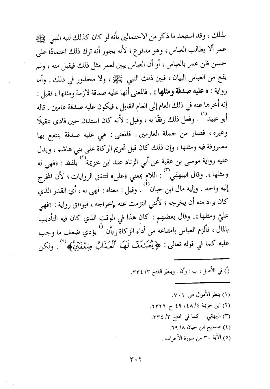 بذلك، وقد استبعد ما ذكر من الاحتمالين بأنه لو كان كذلك لنبه النَّبيُّ - صَلَّى الله عليه وسلم - عمر ألا يطالب العباس، وهو مدفوع؛ لأنَّه يجوز أنَّه ترك ذلك اعتمادًا على حسن ظن عمر بالعباس، أو أن العباس يبين لعمر مثل ذلك فيقبل منه، ولم يقع من العباس البيان، فبين ذلك النَّبيُّ - صلى الله عليه وسلم -، ولا محذور في ذلك. وأمَّا رواية: "عليه صدقة ومثلها". فالمعنى أنها عليه صدقة لازمة ومثلها، فقيل: إنه أخرها عنه في ذلك العام إلى العام القابل، فيكون عليه صدقة عامين. قاله أبو عبيد (¬1). وفعل ذلك رفقًا به، وقيل: لأنَّه كان استدان حين فادى عقيلًا وغيره، فصار من جملة الغارمين. فالمعنى: هي عليه صدقة ينتفع بها مصروفة فيه ومثلها، وإن ذلك كان قبل تحريم الزكاة على بني هاشم، ويدل عليه رواية موسى بن عقبة عن أبي الزناد عند ابن خزيمة (¬2) بلفظ: "فهي له ومثلها". وقال البيهقي (¬3): اللام بمعنى "على" لتتفق الروايات؛ لأنَّ المخرج إليه واحد. وإليه مال ابن حبان (¬4). وقيل: معناه: فهي له؛ أي القدر الذي كان يراد منه أن يخرجه؛ لأنني التزمت عنه بإخراجه، فيوافق رواية: "فهي عليَّ ومثلها". وقال بعضهم: كان هذا في الوقت الذي كان فيه التأديب بالمال، فألزم العباس بامتناعه من أداء الزكاة [بأن] (أ) يؤدي ضعف ما وجب عليه كما في قوله تعالى: {يُضَاعَفْ لَهَا الْعَذَابُ ضِعْفَيْنِ} (¬5). ولكن
