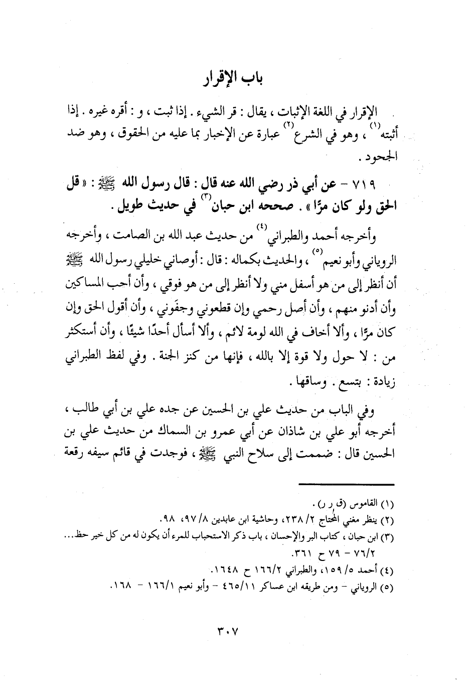719 - عن أبي ذر رضي الله عنه قال: قال رسول الله - صَلَّى الله عليه وسلم -: "قل الحق ولو كان مرًّا". صححه ابن حبان (¬3) في حديث طويل.