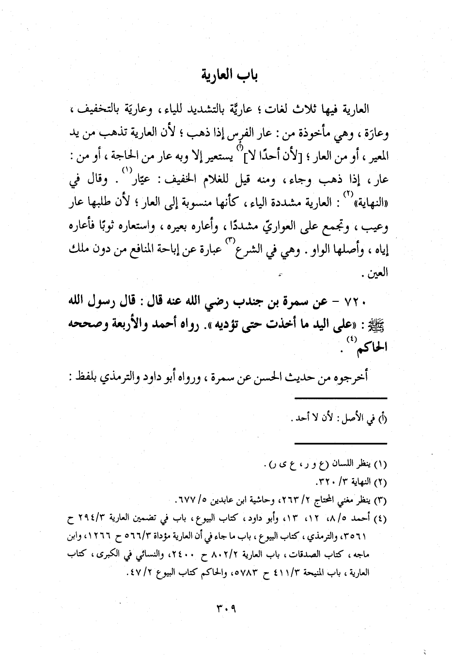 (¬4) أحمد 5/ 8، 12، 13، وأبو داود، كتاب البيوع، باب في تضمين العارية 3/ 294 ح 3561، والترمذي، كتاب البيوع، باب ما جاء في أن العارية مؤداة 3/ 566 ح 1266، وابن ماجة، كتاب الصدقات، باب العارية 2/ 802 ح 2400، والنسائي في الكبرى، كتاب العارية، باب المنيحة 3/ 411 ح 5783، والحاكم كتاب البيوع 2/ 47.