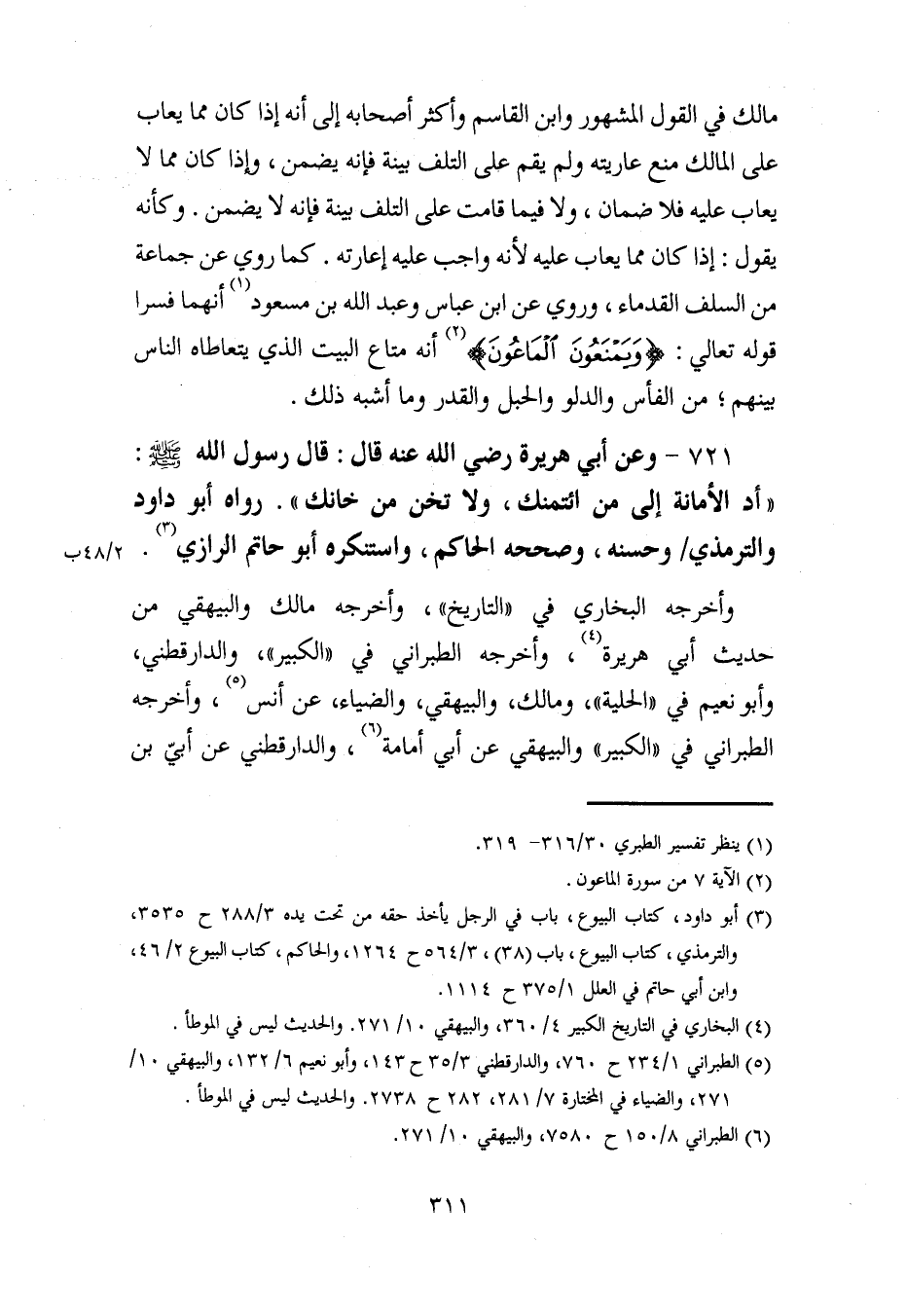 721 - وعن أبي هريرة رضي الله عنه قال: قال رسول الله - صلى الله عليه وسلم -: "أد الأمانة إلى من ائتمنك، ولا تخن من خانك". رواه أبو داود والترمذي وحسنه، وصححه الحاكم، واستنكره أبو حاتم الرازي (¬3).