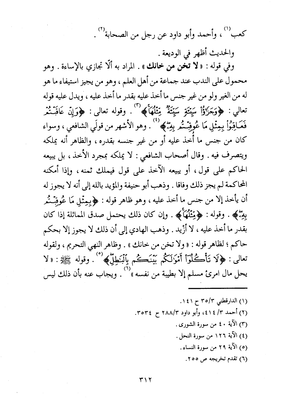 وفي قوله: "لا تخن من خانك". المراد به ألَّا تجازي بالإساءة. وهو محمول على الندب عند جماعة من أهل العلم، وهو من يجيز استيفاء ما هو له من الغير ولو من غير جنس ما أخذ عليه بقدر ما أخذ عليه، ويدل عليه قوله تعالي: {وَجَزَاءُ سَيِّئَةٍ سَيِّئَةٌ مِثْلُهَا} (¬3). وقوله تعالى: {وَإِنْ عَاقَبْتُمْ فَعَاقِبُوا بِمِثْلِ مَا عُوقِبْتُمْ بِهِ} (¬4). وهو الأشهر من قولَي الشافعي، وسواء كان من جنس ما أُخذ عليه أو من غير جنسه بقدره، والظاهر أنَّه يملكه ويتصرف فيه. وقال أصحاب الشافعي: لا يملكه بمجرد الأخذ، بل يبيعه الحاكم على قول، أو يبيعه الآخذ على قول فيملك ثمنه، وإذا أمكنه المحاكمة لم يجز ذلك وفاقا. وذهب أبو حنيفة والمؤيد بالله إلى أنَّه لا يجوز له أن يأخذ إلا من جنس ما أخذ عليه، وهو ظاهر قوله: {بِمِثْلِ مَا عُوقِبْتُمْ بِهِ}. وقوله: {مِثْلُهَا}. وإن كان ذلك يحتمل صدق المماثلة إذا كان بقدر ما أخذ عليه، لا أزْيد. وذهب الهادي إلى أن ذلك لا يجوز إلا بحكم حاكم؛ لظاهر قوله: "ولا تخن من خانك". وظاهر النهي التحريم، ولقوله تعالى: {لَا تَأْكُلُوا أَمْوَالَكُمْ بَيْنَكُمْ بِالْبَاطِلِ} (¬5). وقوله - صلى الله عليه وسلم -: "لا يحل مال امرئ مسلم إلا بطيبة من نفسه" (¬6). ويجاب عنه بأن ذلك ليس