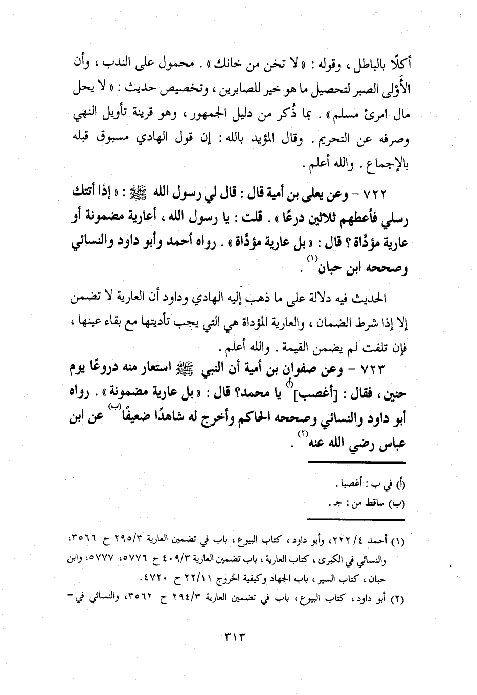 723 - وعن صفوان بن أمية أن النبي - صلى الله عليه وسلم - استعار منه دروعًا يوم حنين، فقال: [أغصب] (أ) يا محمد؟ قال: "بل عارية مضمونة". رواه أبو داود والنسائي وصححه الحاكم وأخرج له شاهدًا ضعيفًا (5) عن ابن عباس رضي الله عنه (¬2).