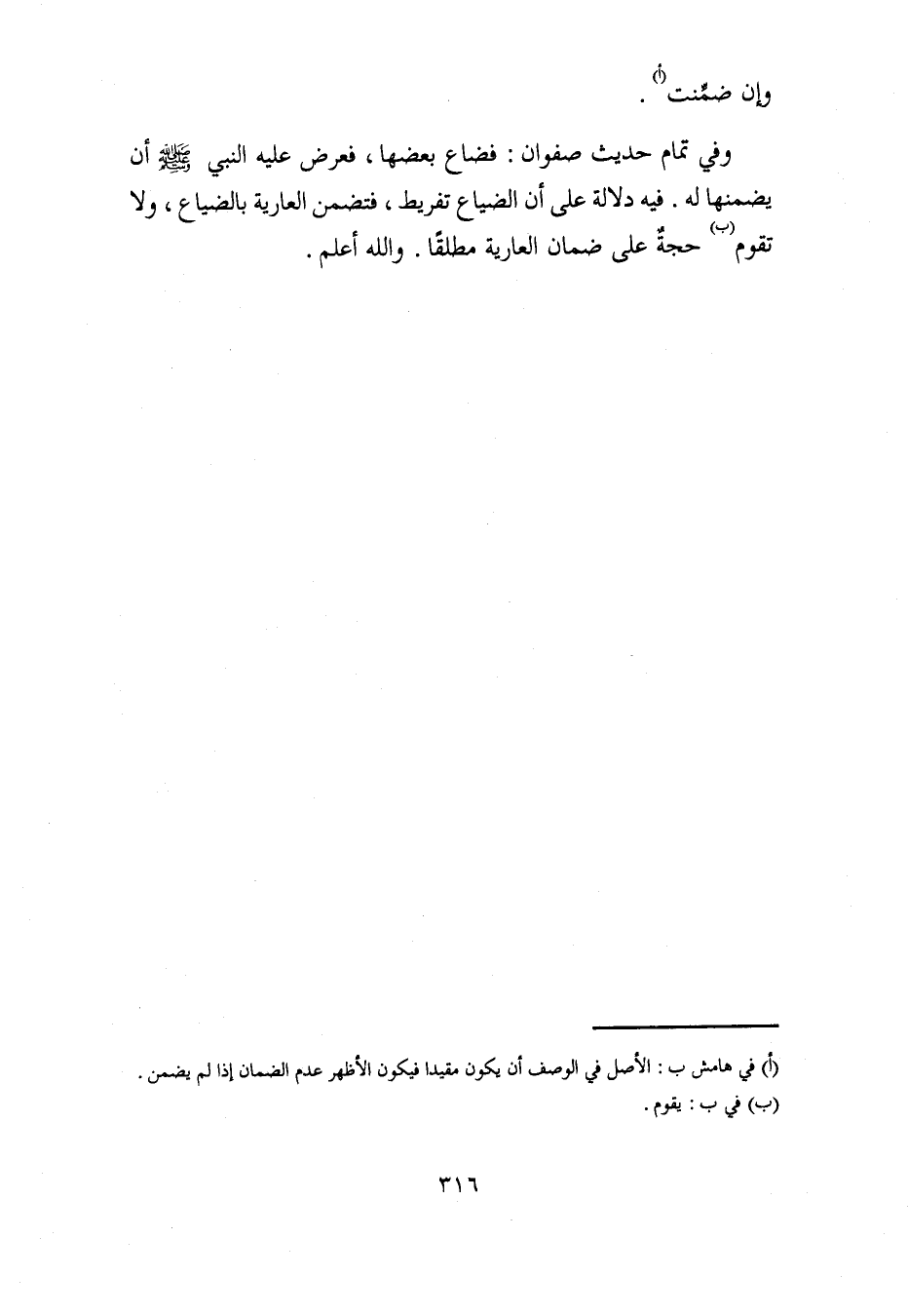 وفي تمام حديث صفوان: فضاع بعضها، فعرض عليه النبي - صلى الله عليه وسلم - أن يضمنها له. فيه دلالة على أن الضياع تفريط، فتضمن العارية بالضياع، ولا تقوم (ب) حجةٌ على ضمان العارية مطلقًا. والله أعلم.