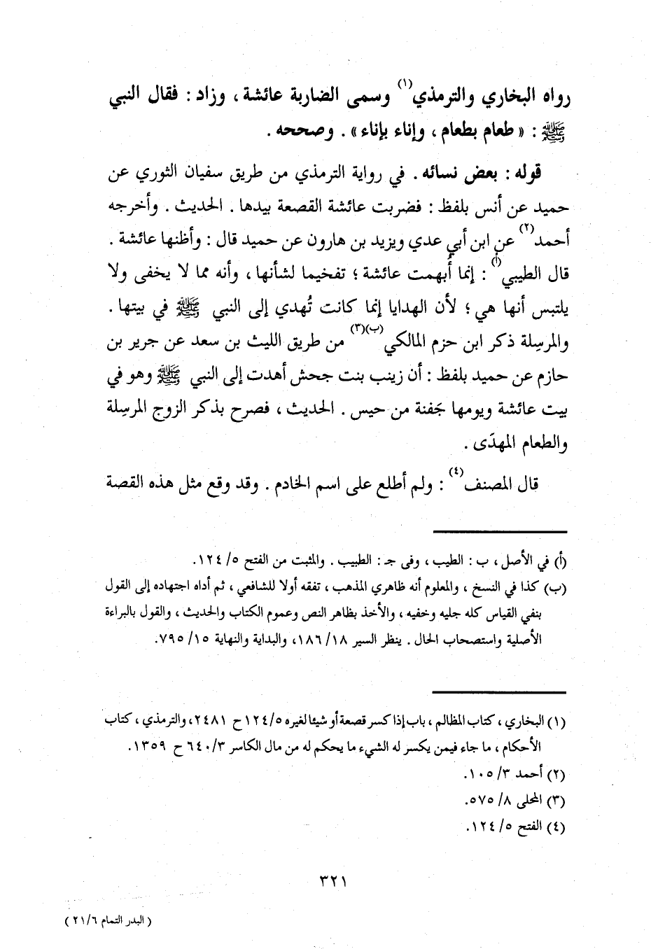 (¬1) البخاري، كتاب المظالم، باب إذا كسر قصعة أو شيئًا لغيره 5/ 124 ح 2481، والترمذي، كتاب الأحكام، ما جاء فيمن يكسر له الشيء ما يحكم له من مال الكاسر 3/ 640 ح 1359.