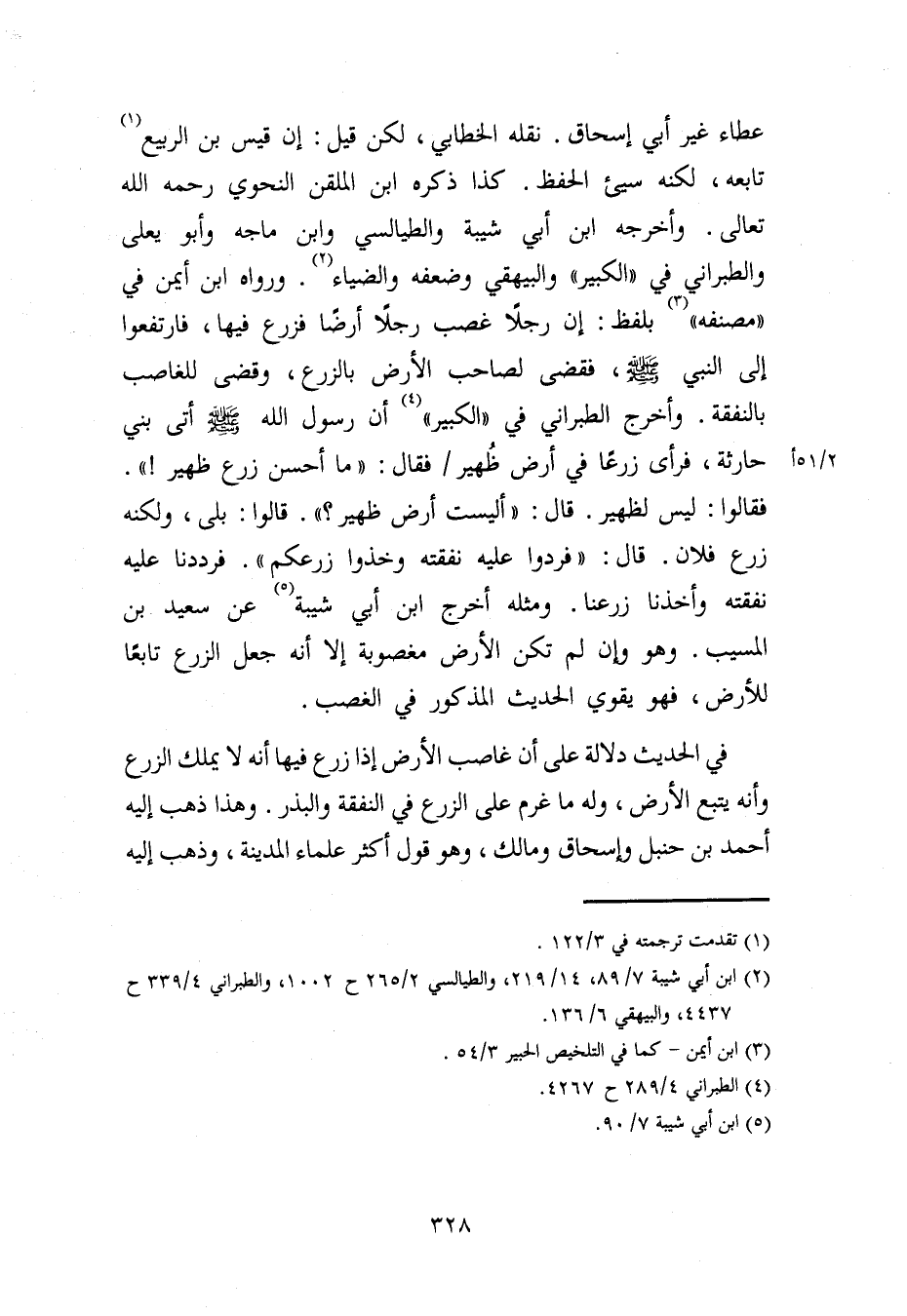 عطاء غير أبي إسحاق. نقله الخطابي، لكن قيل: إن قيس بن الربيع (¬1) تابعه، لكنه سيئ الحفظ. كذا ذكره ابن الملقن النحوي رحمه الله تعالى. وأخرجه ابن أبي شيبة والطيالسي وابن ماجة وأبو يعلى والطبراني في "الكبير" والبيهقي وضعفه والضياء (¬2). ورواه ابن أيمن في "مصنفه" (¬3) بلفظ: إن رجلًا غصب رجلًا أرضًا فزرع فيها، فارتفعوا إلى النبي - صلى الله عليه وسلم -، فقضى لصاحب الأرض بالزرع، وقضى للغاصب بالنفقة. وأخرج الطبراني في "الكبير" (¬4) أن رسول الله - صلى الله عليه وسلم - أتى بني حارثة، فرأى زرعًا في أرض ظُهير فقال: "ما أحسن زرع ظهير! ". فقالوا: ليس لظهير. قال: "أليست أرض ظهير؟ ". قالوا: بلى، ولكنه زرع فلان. قال: "فردوا عليه نفقته وخذوا زرعكم". فرددنا عليه نفقته وأخذنا زرعنا. ومثله أخرج ابن أبي شيبة (¬5) عن سعيد بن المسيب. وهو وإن لم تكن الأرض مغصوبة إلا أنَّه جعل الزرع تابعًا للأرض، فهو يقوي الحديث المذكور في الغصب.