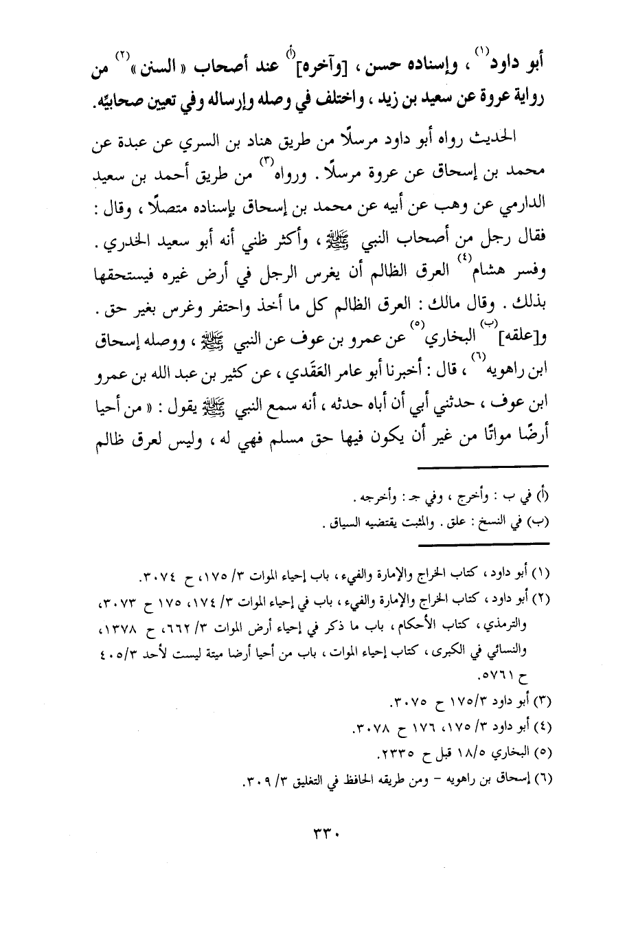 (¬2) أبو داود، كتاب الخراج والإمارة والفيء، باب في إحياء الموات 3/ 174، 175 ح 3073، والترمذي، كتاب الأحكام، باب ما ذكر في إحياء أرض الموات 3/ 662، ح 1378، والنسائي في الكبرى، كتاب إحياء الموات، باب من أحيا أرضا ميتة ليست لأحد 3/ 405 ح 5761.