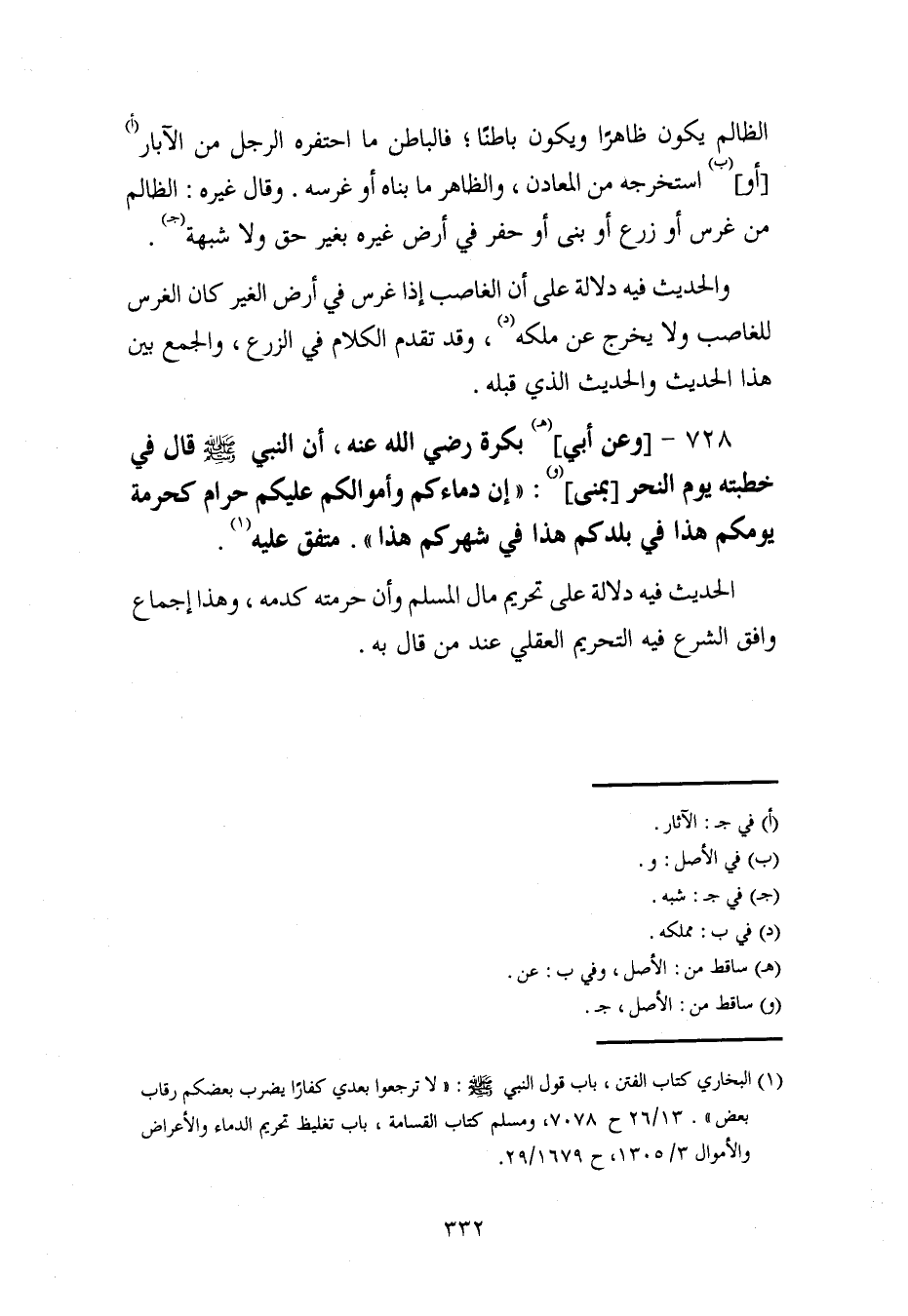 728 - [وعن أبي] (هـ) بكرة رضي الله عنه، أن النبي - صلى الله عليه وسلم - قال في خطبته يوم النحر [بمنى] (و): "إن دماءكم وأموالكم عليكم حرام كحرمة يومكم هذا في بلدكم هذا في شهركم هذا". متفق عليه (¬1).