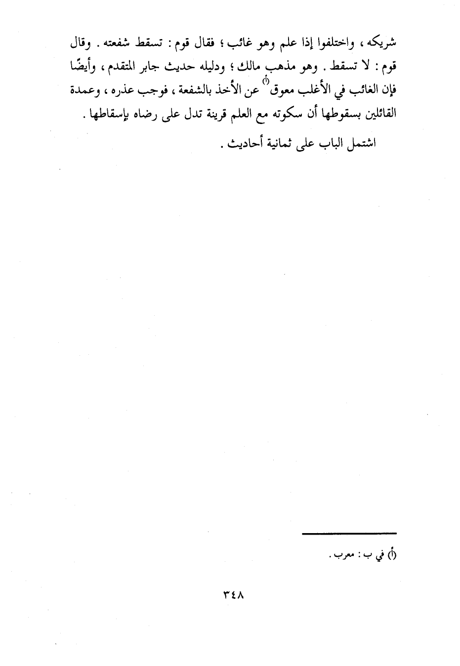 شريكه، واختلفوا إذا علم وهو غائب؛ فقال قوم: تسقط شفعته. وقال قوم: لا تسقط. وهو مذهب مالك؛ ودليله حديث جابر المتقدم، وأيضًا فإن الغائب في الأغلب معوق (أ) عن الأخذ بالشفعة، فوجب عذره، وعمدة القائلين بسقوطها أن سكوته مع العلم قرينة تدل على رضاه بإسقاطها.