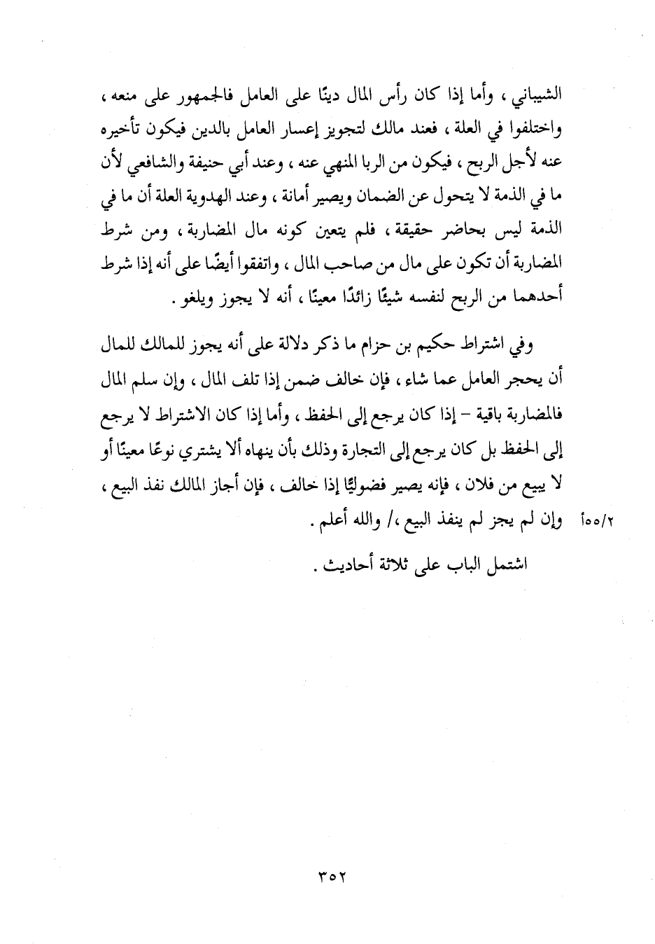 الشيباني، وأما إذا كان رأس المال دينًا على العامل فالجمهور على منعه، واختلفوا في العلة، فعند مالك لتجويز إعسار العامل بالدين فيكون تأخيره عنه لأجل الربح، فيكون من الربا المنهي عنه، وعند أبي حنيفة والشافعي لأن ما في الذمة لا يتحول عن الضمان ويصير أمانة، وعند الهدوية العلة أن ما في الذمة ليس بحاضر حقيقة، فلم يتعين كونه مال المضاربة، ومن شرط المضاربة أن تكون على مال من صاحب المال، واتفقوا أيضًا على أنَّه إذا شرط أحدهما من الربح لنفسه شيئًا زائدًا معينًا، أنَّه لا يجوز ويلغو.