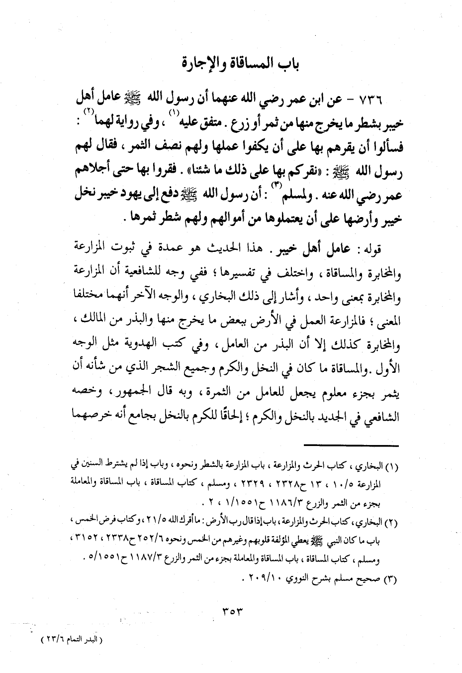 736 - عن ابن عمر رضي الله عنهما أن رسول الله - صلى الله عليه وسلم - عامل أهل خيبر بشطر ما يخرج منها من ثمر أو زرع. متفق عليه (¬1)، وفي رواية لهما (¬2): فسألوا أن يقرهم بها على أن يكفوا عملها ولهم نصف الثمر، فقال لهم رسول الله - صلى الله عليه وسلم -: "نقركم بها على ذلك ما شئنا". فقروا بها حتَّى أجلاهم عمر رضي الله عنه. ولمسلم (¬3): أن رسول الله - صلى الله عليه وسلم - دفع إلى يهود خيبر نخل خيبر وأرضها على أن يعتملوها من أموالهم ولهم شطر ثمرها.