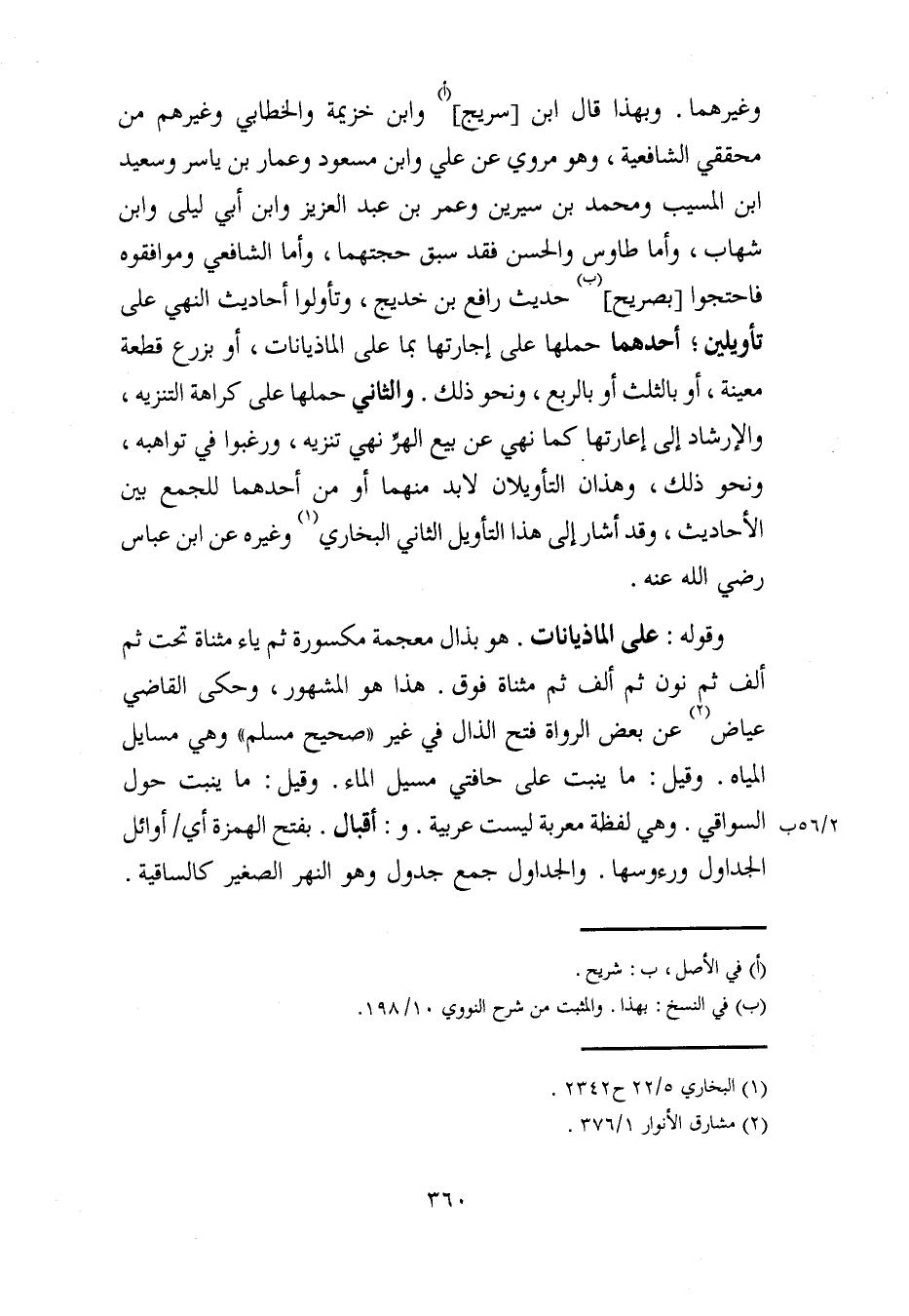 وغيرهما. وبهذا قال ابن [سريج] (أ) وابن خزيمة والخطابي وغيرهم من محققي الشافعية، وهو مروي عن علي وابن مسعود وعمار بن ياسر وسعيد ابن المسيب ومحمد بن سيرين وعمر بن عبد العزيز وابن أبي ليلى وابن شهاب، وأما طاوس والحسن فقد سبق حجتهما، وأما الشافعي وموافقوه فاحتجوا [بصريح] (ب) حديث رافع بن خديج، وتأولوا أحاديث النهي على تأويلين؛ أحدهما حملها على إجارتها بما على الماذيانات، أو بزرع قطعة معينة، أو بالثلث أو بالربع، ونحو ذلك. والثاني حملها على كراهة التنزيه، والإرشاد إلى إعارتها كما نهي عن بيع الهرِّ نهي تنزيه، ورغبوا في تواهبه، ونحو ذلك، وهذان التأويلان لا بد منهما أو من أحدهما للجمع بين الأحاديث، وقد أشار إلى هذا التأويل الثاني البخاري (¬1) وغيره عن ابن عباس رضي الله عنه.