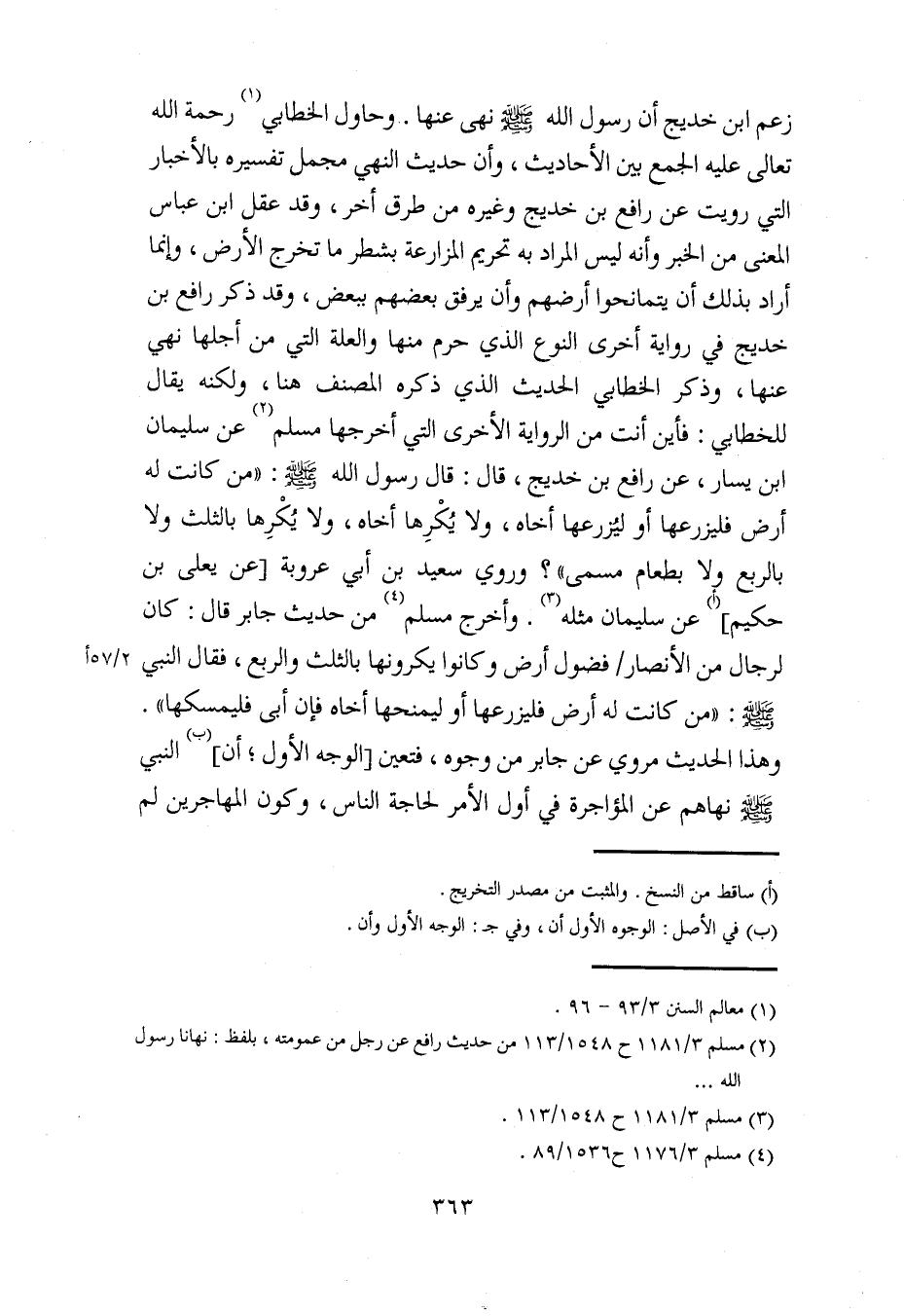 زعم ابن خديج أن رسول الله - صلى الله عليه وسلم - نهى عنها .. وحاول الخطابي (¬1) رحمة الله تعالى عليه الجمع بين الأحاديث، وأن حديث النهي مجمل تفسيره بالأخبار التي رويت عن رافع بن خديج وغيره من طرق أخر، وقد عقل ابن عباس المعنى من الخبر وأنه ليس المراد به تحريم المزارعة بشطر ما تخرج الأرض، وإنما أراد بذلك أن يتمانحوا أرضهم وأن يرفق بعضهم ببعض، وقد ذكر رافع بن خديج في رواية أخرى النوع الذي حرم منها والعلة التي من أجلها نهي عنها، وذكر الخطابي الحديث الذي ذكره المصنف هنا، ولكنه يقال للخطابي: فأين أنت من الرواية الأخرى التي أخرجها مسلم (¬2) عن سليمان بن يسار، عن رافع بن خديج، قال: قال رسول الله - صلى الله عليه وسلم -: "من كانت له أرض فليزرعها أو ليُزرعها أخاه، ولا يُكْرِها أخاه، ولا يُكْرِها بالثلث ولا بالربع ولا بطعام مسمى"؟ وروي سعيد بن أبي عروبة [عن يعلى بن حكيم] (أ) عن سليمان مثله (¬3). وأخرج مسلم (¬4) من حديث جابر قال: كان لرجال من الأنصار فضول أرض وكانوا يكرونها بالثلث والربع، فقال النبي - صلى الله عليه وسلم -: "من كانت له أرض فليزرعها أو ليمنحها أخاه فإن أبي فليمسكها". وهذا الحديث مروي عن جابر من وجوه، فتعين [الوجه الأول؛ أن] (ب) النبي - صلى الله عليه وسلم - نهاهم عن المؤاجرة في أول الأمر لحاجة الناس، وكون المهاجرين لم