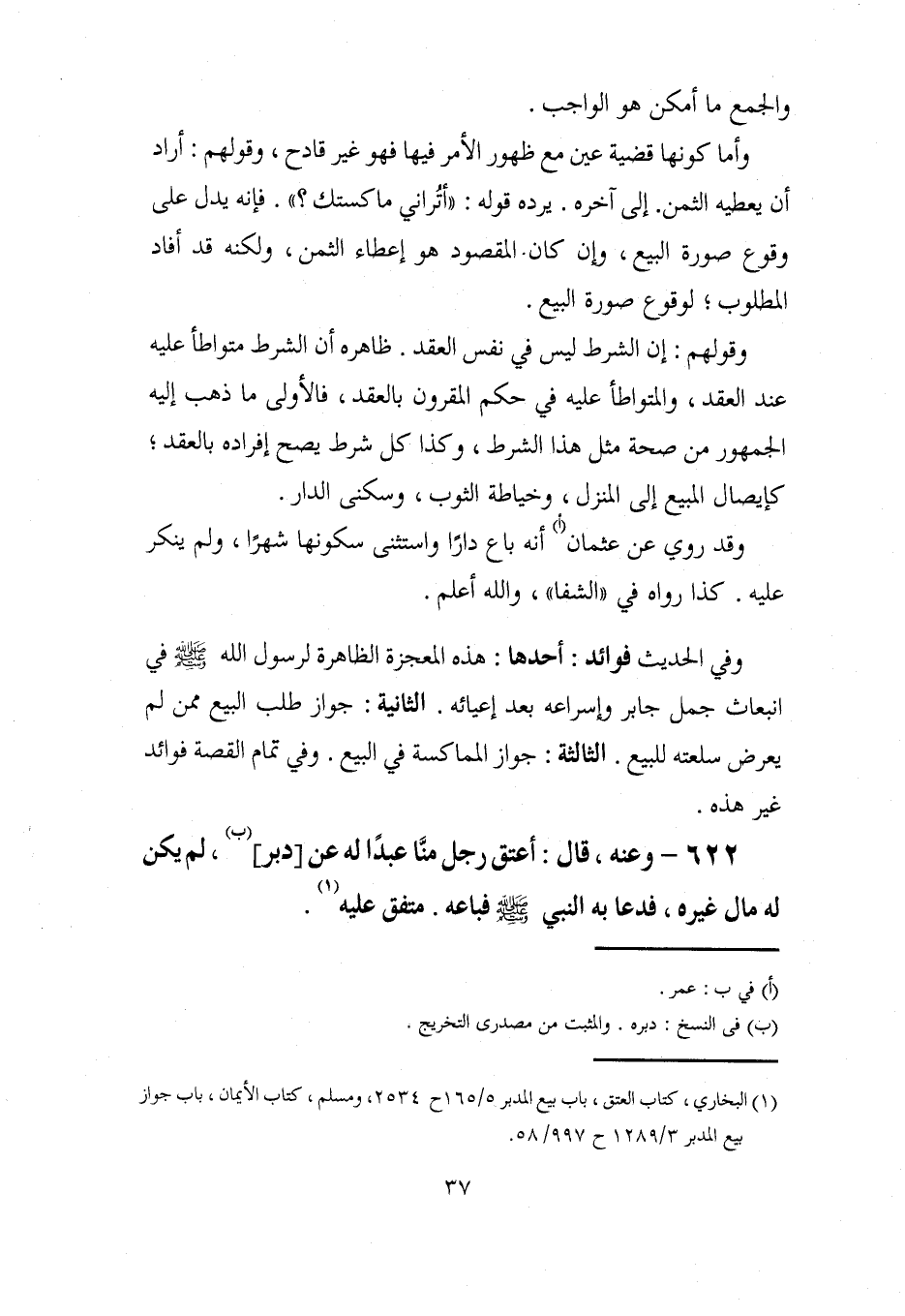 (¬1) البخاري، كتاب العتق، باب بيع الدبر 5/ 165 ح 2534، ومسلم، كتاب الأيمان، باب جواز بيع الدبر 3/ 1289 ح 997/ 58.