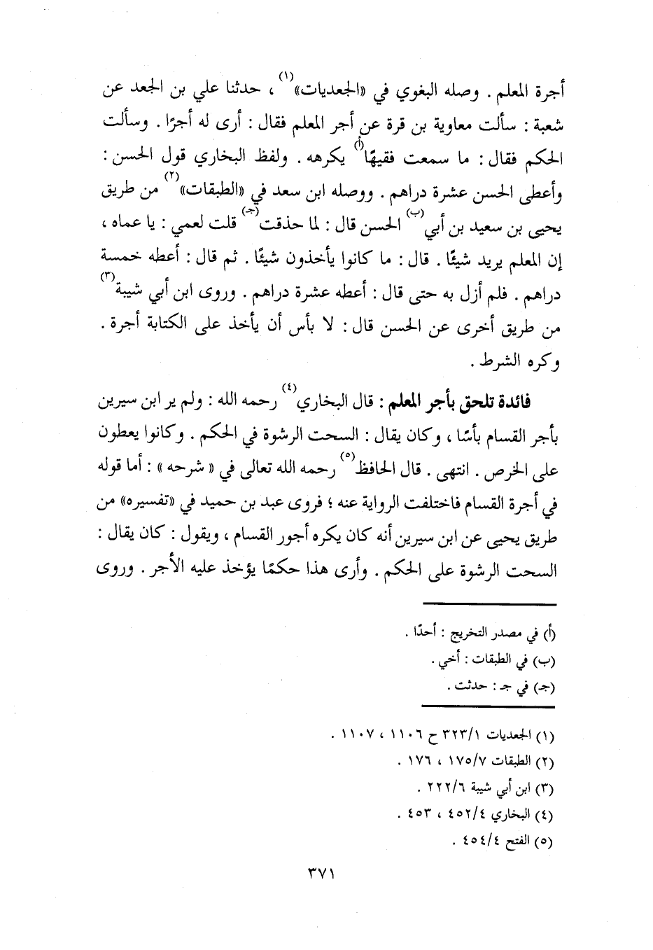 فائدة تلحق بأجر المعلم: قال البخاري (¬4) رحمه الله: ولم ير ابن سيرين بأجر القسام بأسًا، وكان يقال: السحت الرشوة في الحكم. وكانوا يعطون على الخرص. انتهى. قال الحافظ (¬5) رحمه الله تعالى في "شرحه": أما قوله في أجرة القسام فاختلفت الرواية عنه؛ فروى عبد بن حميد في "تفسيره" من طريق يحيى عن ابن سيرين أنه كان يكره أجور القسام، ويقول: كان يقال: السحت الرشوة على الحكم. وأرى هذا حكمًا يؤخذ عليه الأجر. وروى
