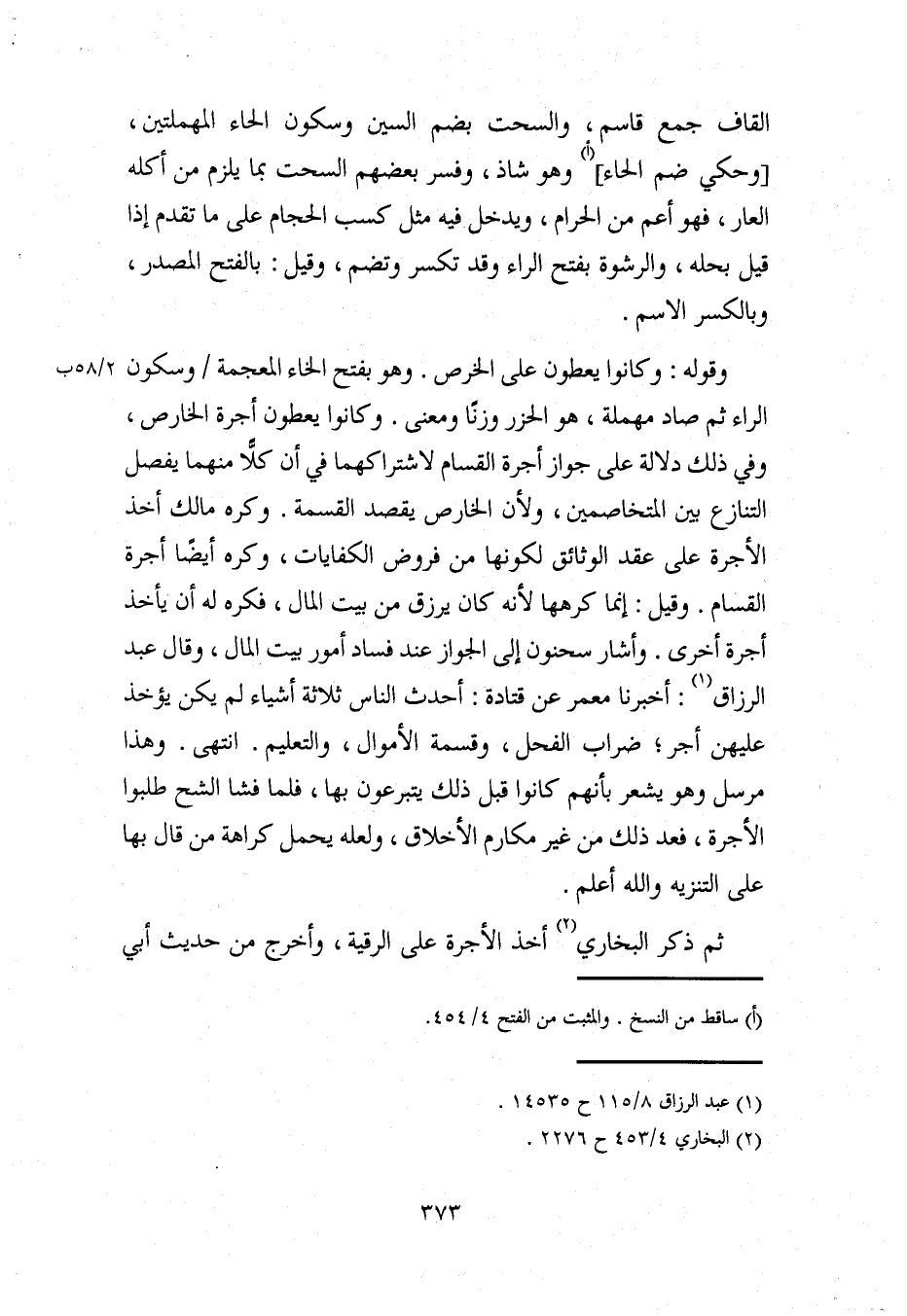 القاف جمع قاسم، والسحت بضم السين وسكون الحاء الهملتين، [وحكي ضم الحاء] (أ) وهو شاذ، وفسر بعضهم السحت بما يلزم من أكله العار، فهو أعم من الحرام، ويدخل فيه مثل كسب الحجام على ما تقدم إذا قيل بحله، والرشوة بفتح الراء وقد تكسر وتضم، وقيل: بالفتح المصدر، وبالكسر الاسم.